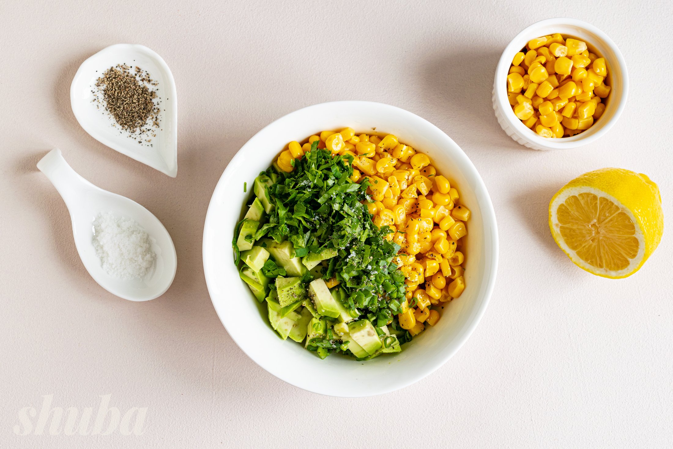 Авокадо розріж навпіл, видали кісточку, наріж м’якоть кубиками, переклади в миску. Додай консервовану кукурудзу, подрібнену зелену цибулю та петрушку. Вичави сік лимона, посоли й поперчи за смаком, все перемішай.
