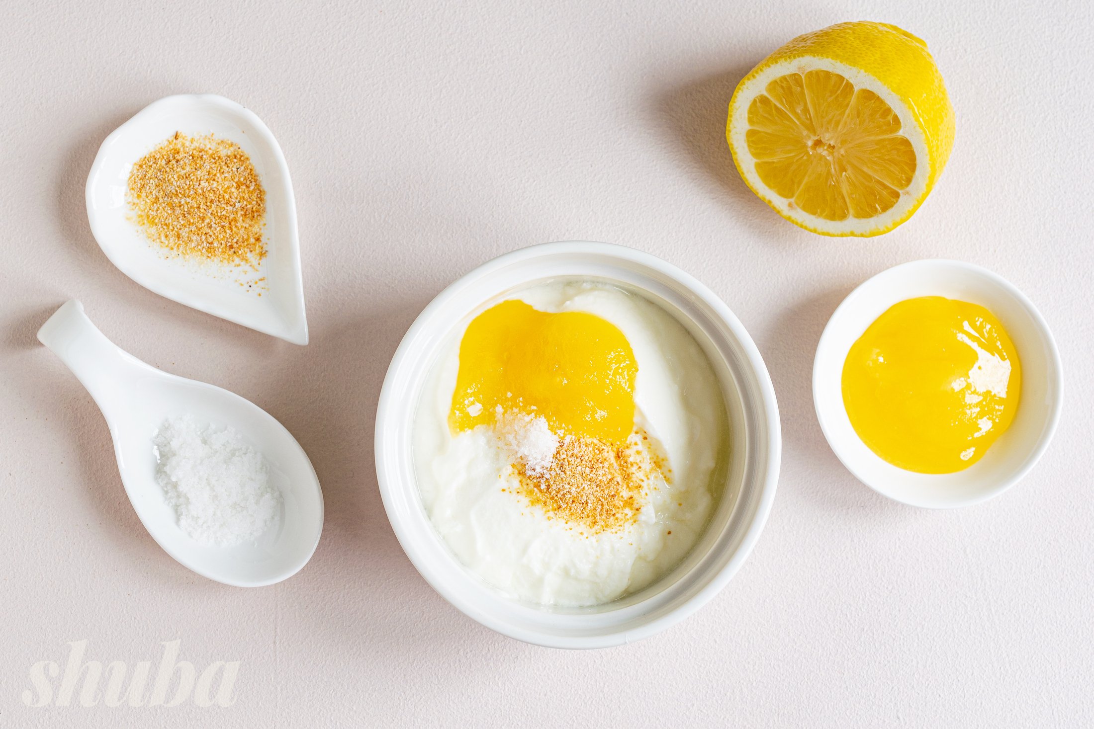 Змішай у невеликій мисці грецький йогурт, сік лимона, мед, сушений часник і дрібку солі. Перемішай інгредієнти до однорідної консистенції.
