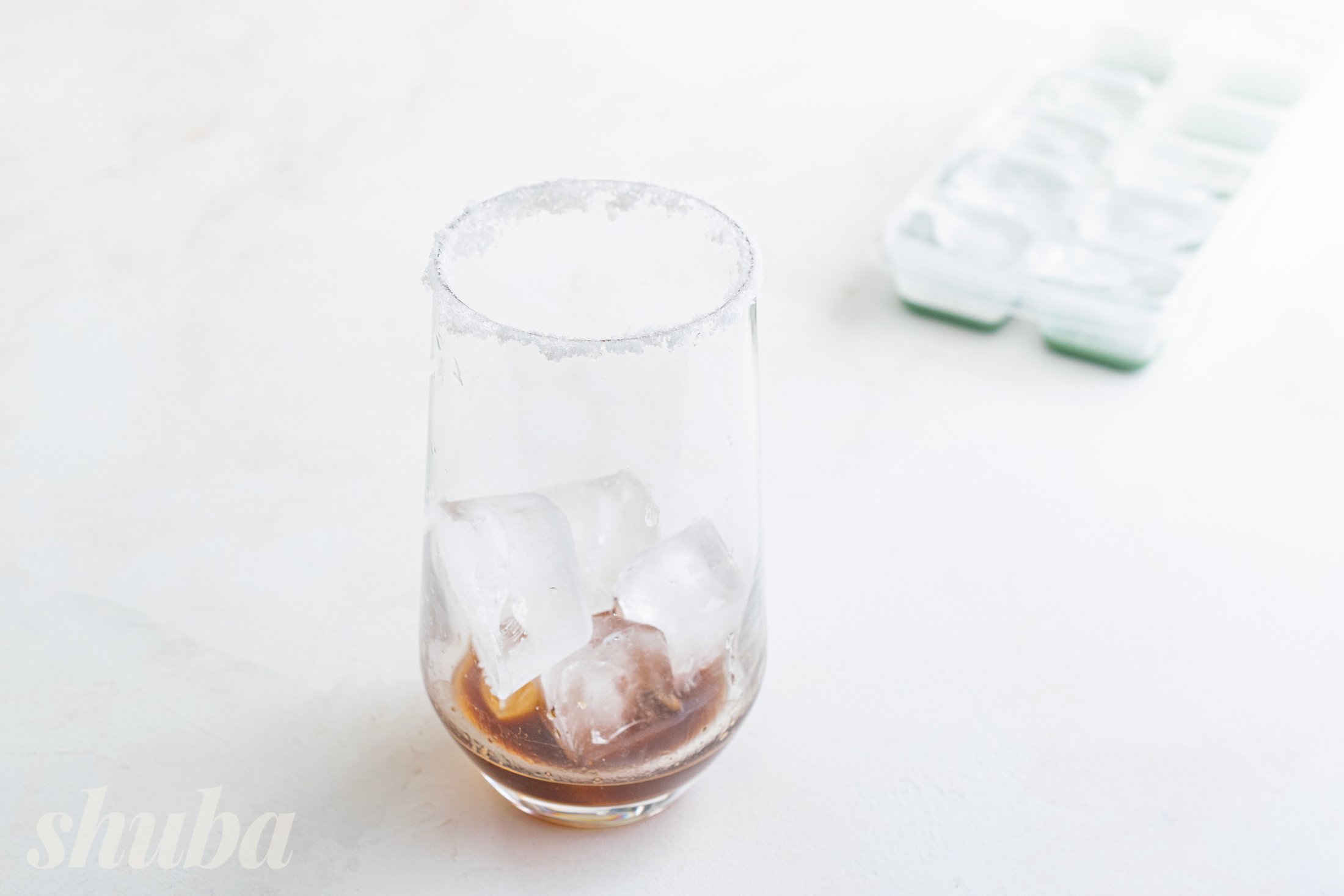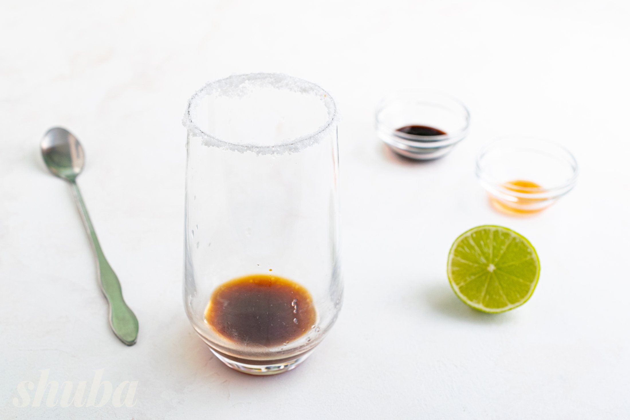Візьми великий скляний келих. Проведи часточкою лайма по краю та занур його в сіль, щоб утворилася соляна облямівка.