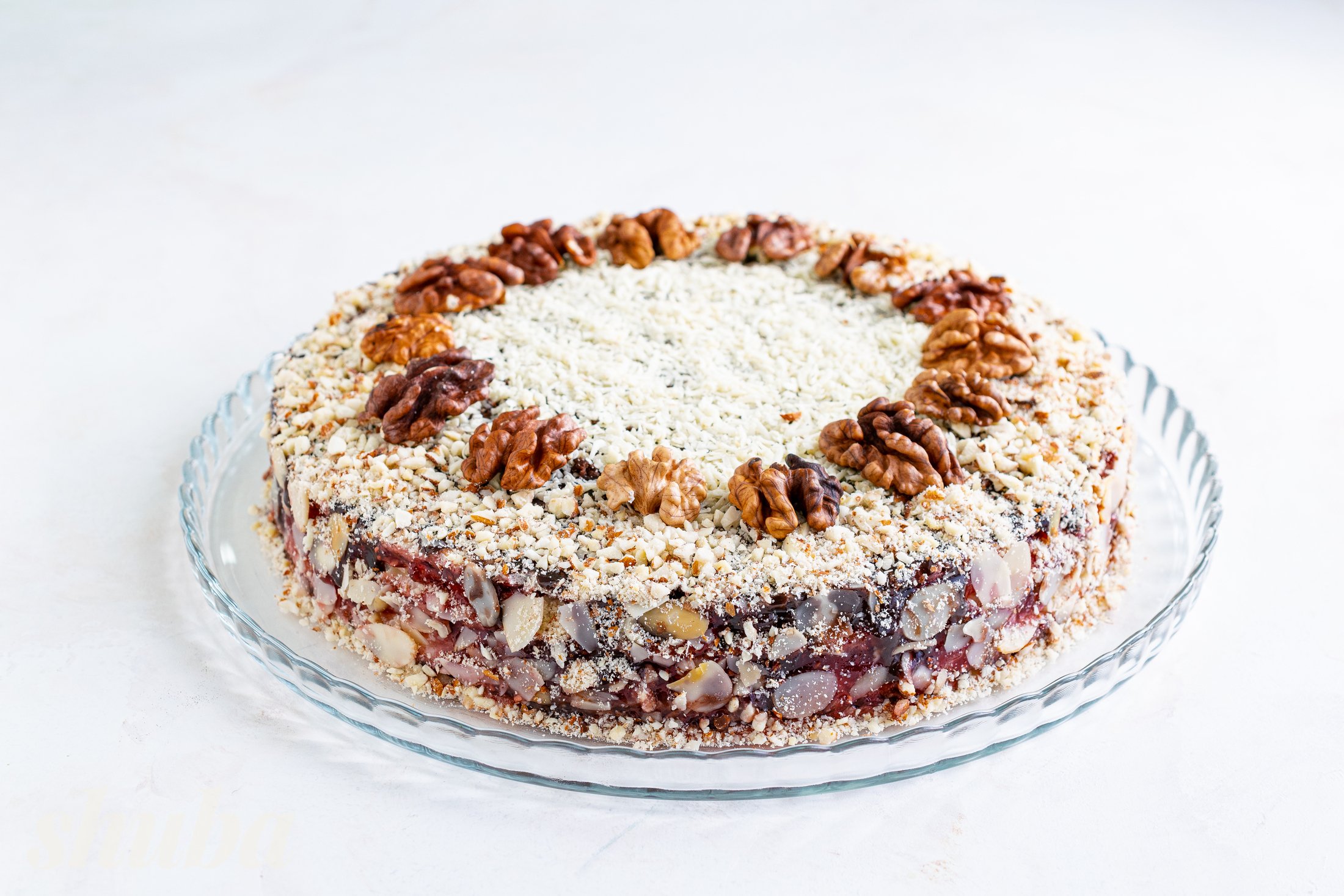 Чергуй начинки та збирай торт, поки не використаєш всі коржі. Злегка притисни його, щоб шари з’єдналися. Мигдаль дрібно наріж, прикрась ним боки. Верх посип тертим білим шоколадом і виклади волоські горіхи.