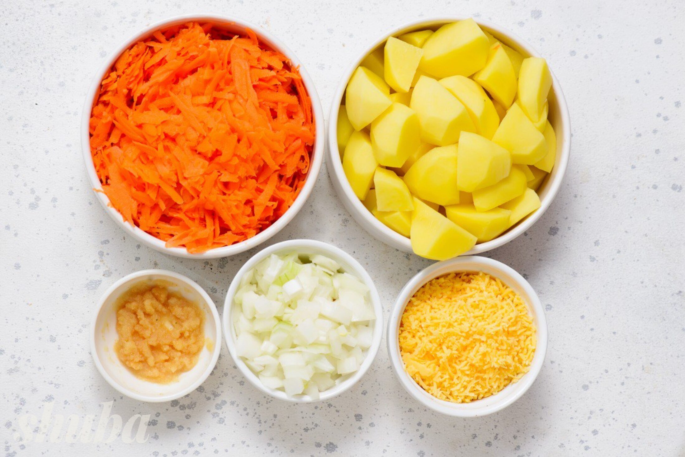 Почисть картоплю, моркву, цибулю та часник. Картоплю наріж кубиками, моркву натри на крупній тертці, цибулю наріж кубиками, часник подрібни. Сир натри дрібно.