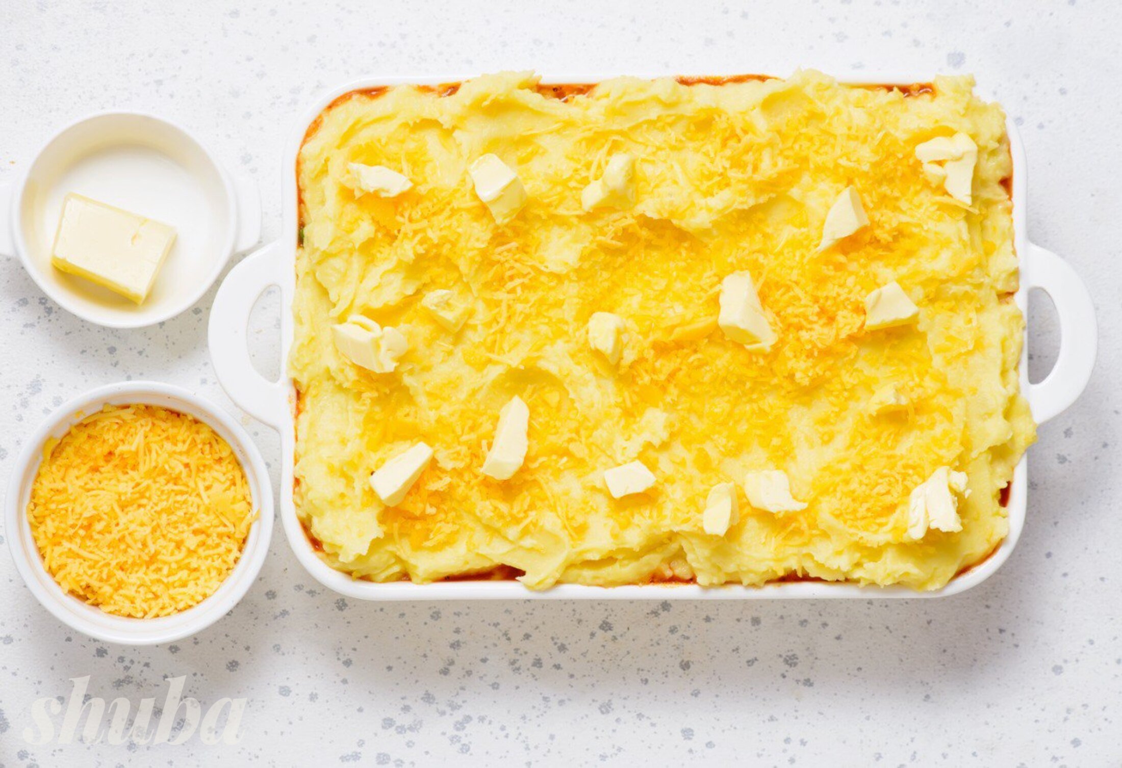 Виклади м’ясну начинку на дно жаротривкої форми. Зверху рівномірно розподіли картопляне пюре. Посип сиром і розклади шматочки масла.
