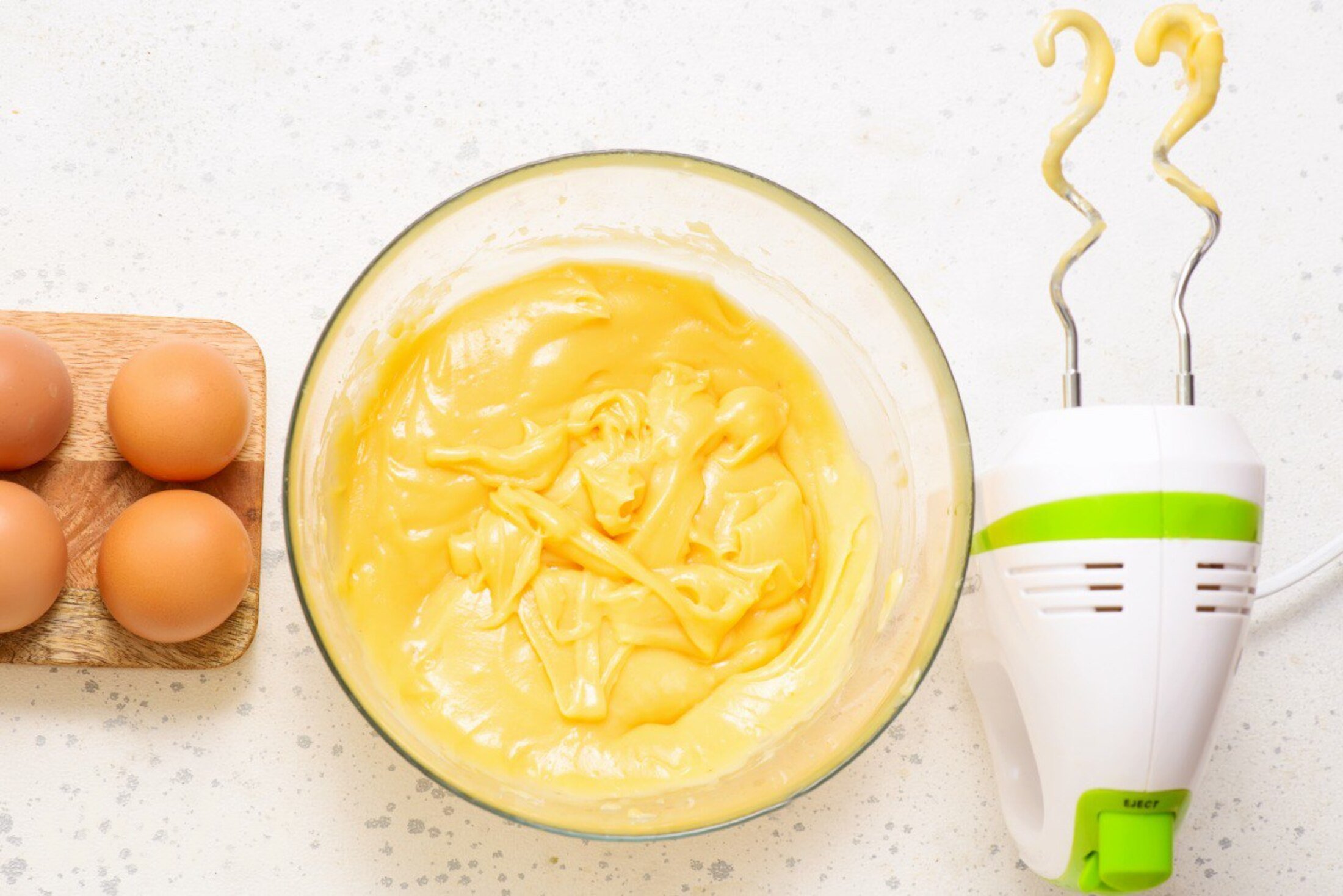 Переклади гаряче тісто в миску або чашу міксера. Почни збивати і по одному додай 3 яйця. Оціни консистенцію: якщо тісто занадто густе і не тягнеться стрічкою — додай ще 1 яйце.