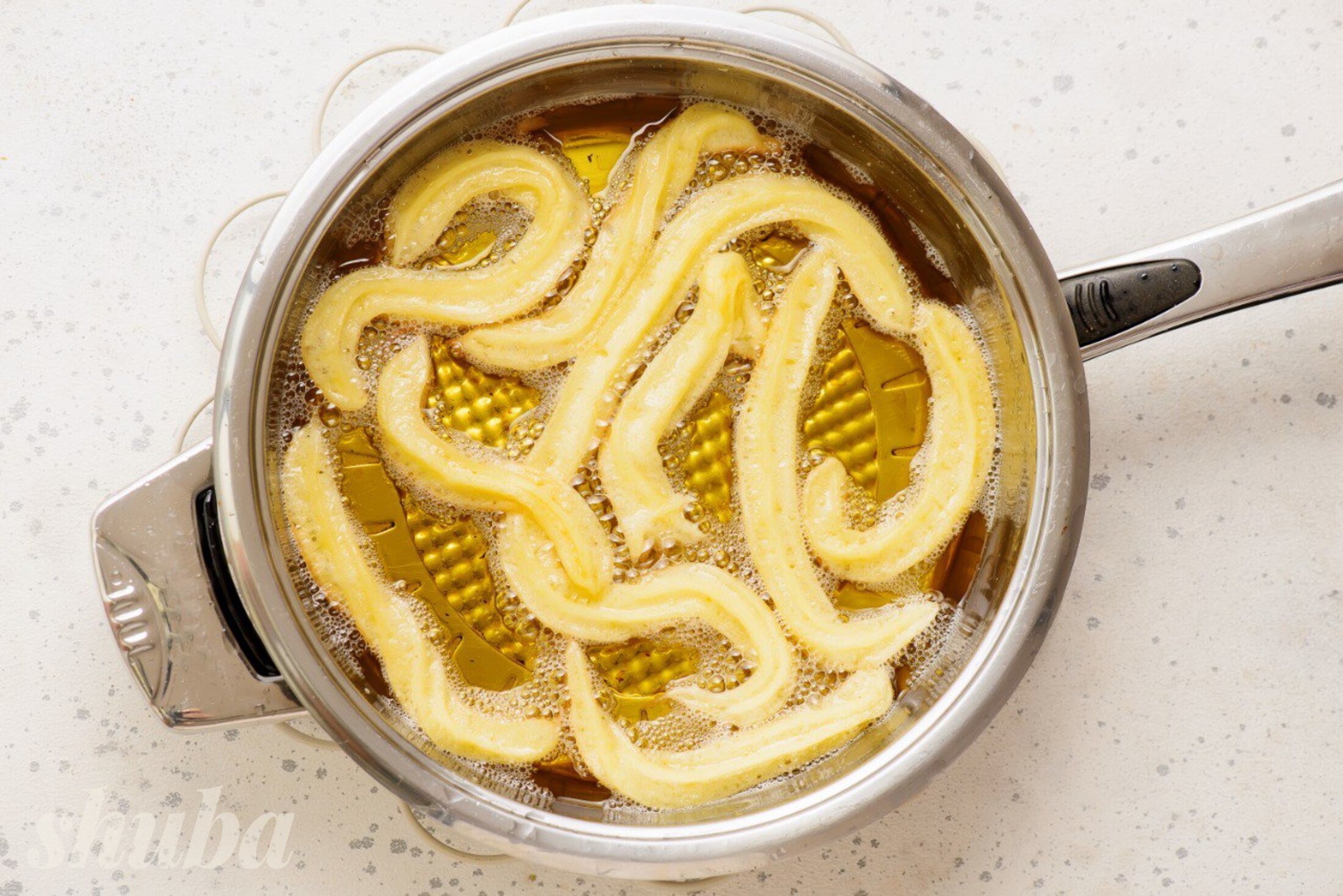 Смажити треба у фритюрі при стабільній температурі 180°C, якщо олія буде холоднішою, чурос вбиратимуть жир, якщо гарячішою, то швидко згорять.