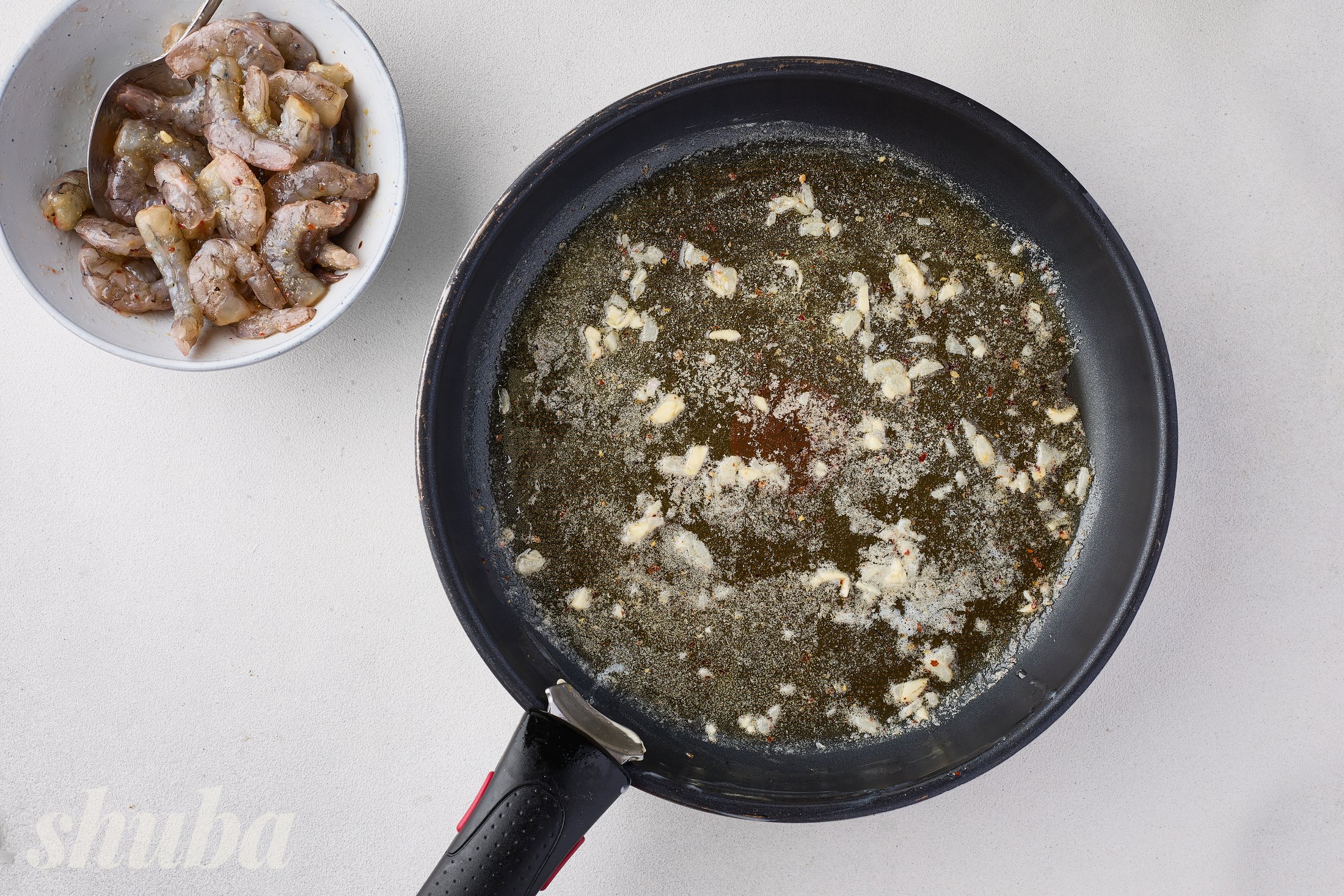- креветки обсмажуй дуже швидко, буквально кілька хвилин, щоб вони залишилися соковитими та мʼякими. Достатньо смажити до порожевіння креветок;