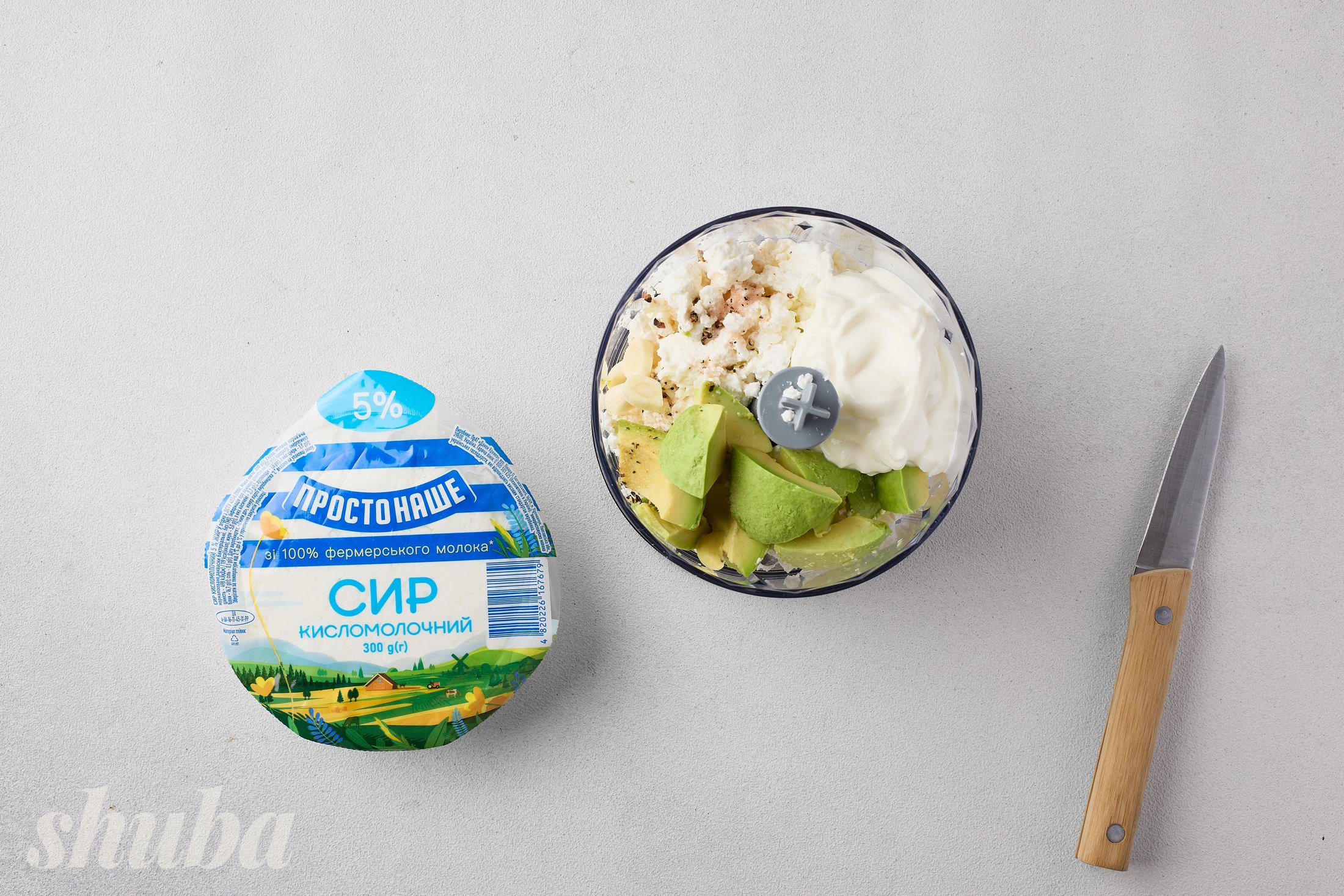 Для сирної намазки важливо використовувати якісний кисломолочний сир з однорідною текстурою. Переконайтеся, що він не занадто кислий. Ми вибрали сир «ПростоНаше» 5%, що ідеально підходить до намазок і паштетів, бо легко перебивається в однорідну кремову масу без крупинок і не віддає зайвої вологи. Така намазка гарно тримає форму на хлібі й не розтікається.