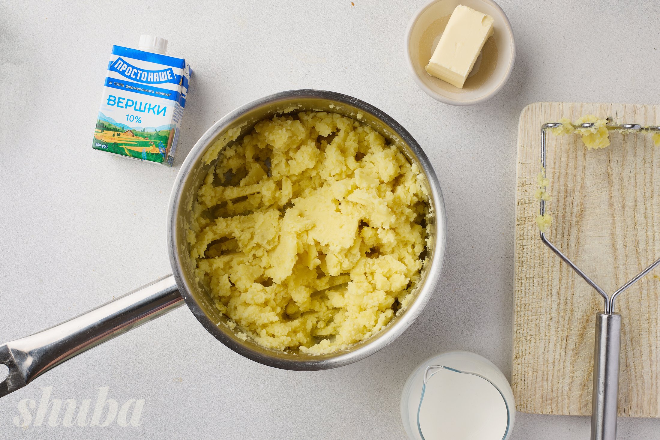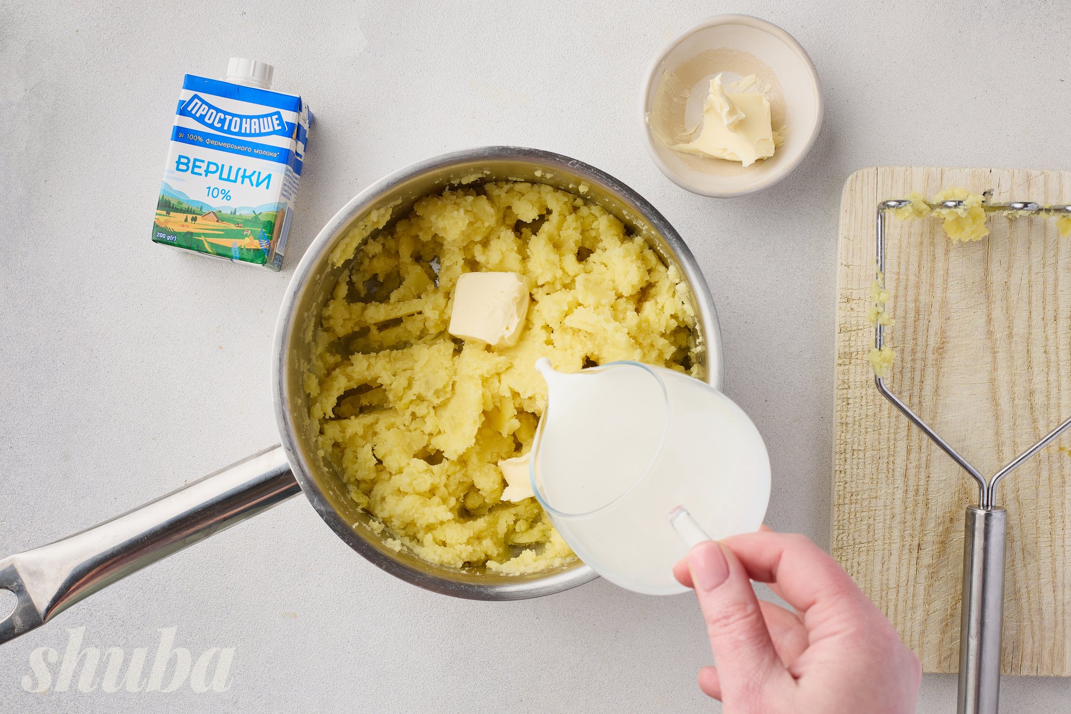 - картопля буває різна, тож орієнтуйся на густину пюре, не вливай всі вершки відразу. А якщо пюре здається рідким, прогрій його ще 1–2 хвилини на слабкому вогні, помішуючи.