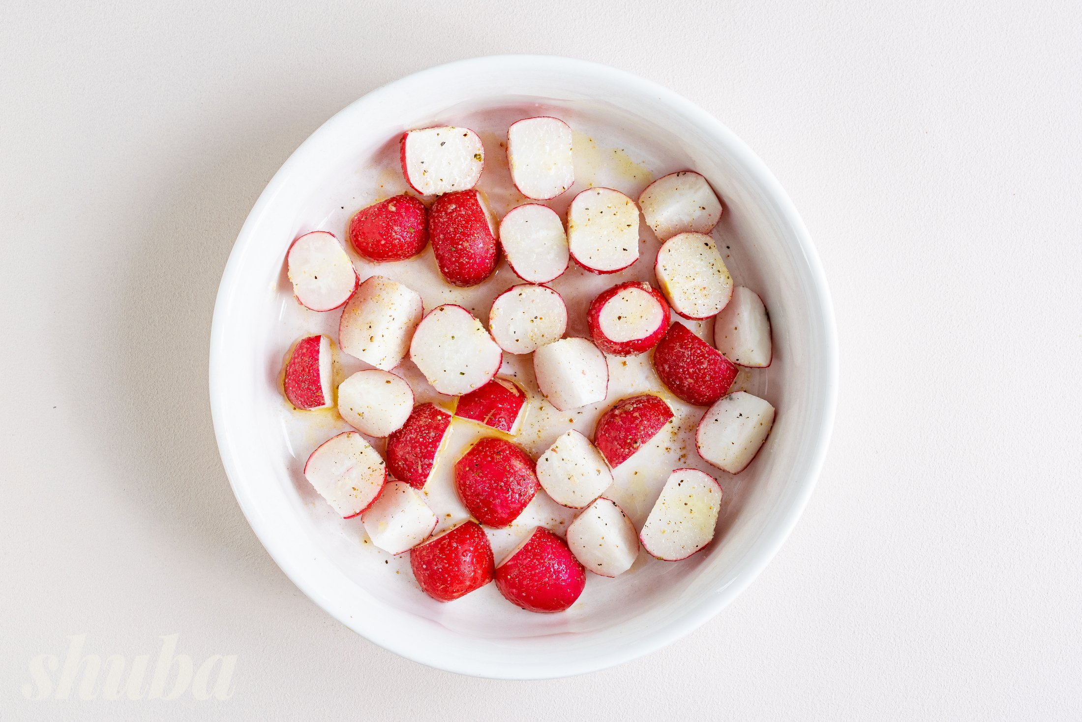 Вимий редис під проточною водою, зріж хвостики та залишки зелені. Великі плоди розріж навпіл, щоб вони рівномірно пропеклися, переклади у глибокий посуд. Додай оливкову олію, сіль, чорний перець і сушений часник.