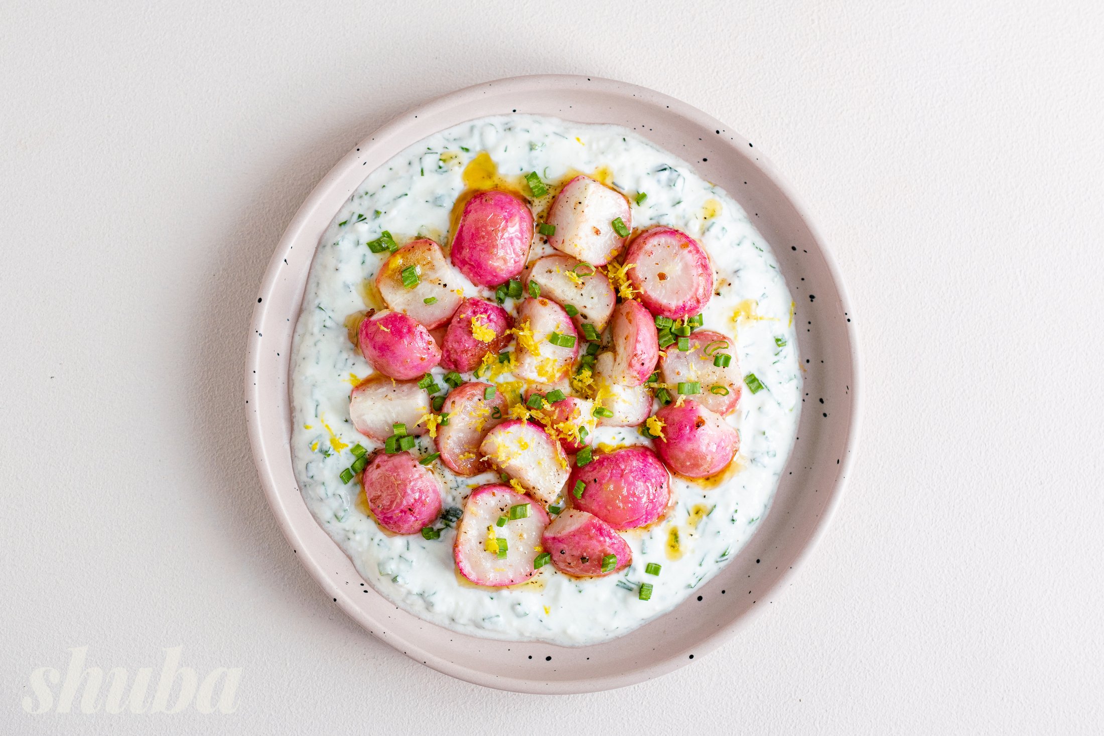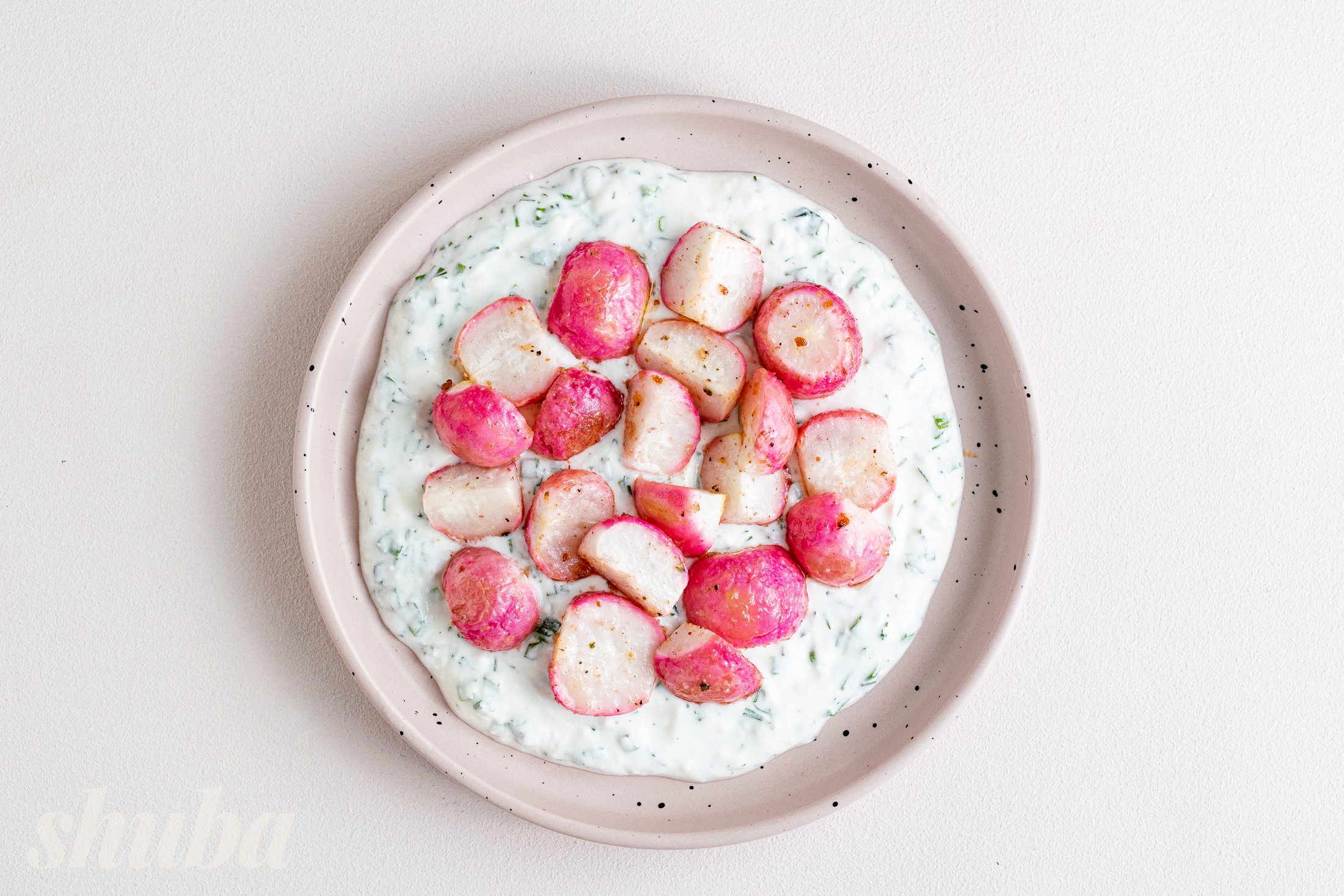 Розподіли йогуртовий соус рівним шаром на тарілці. Зверху виклади гарячий запечений редис.