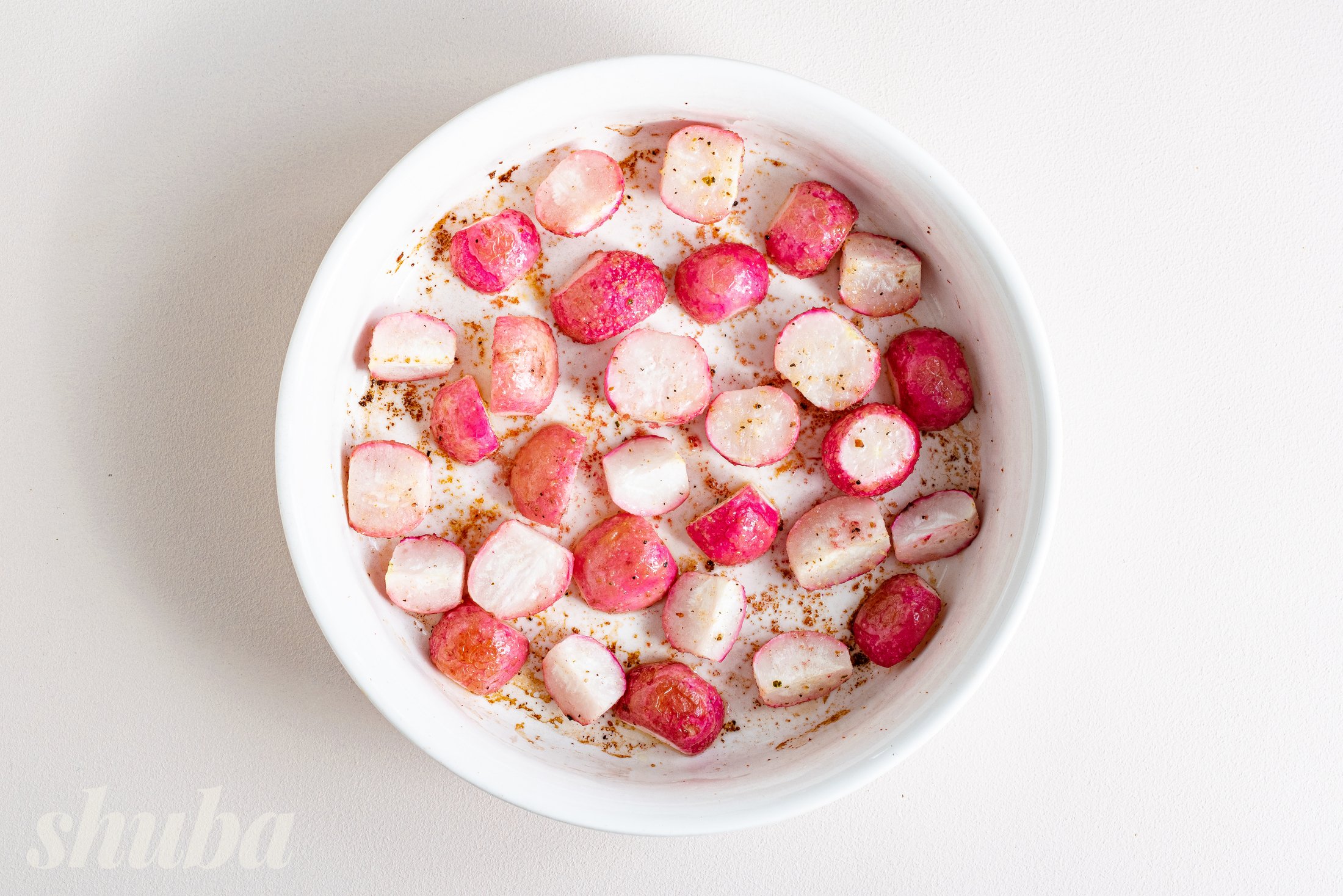 Ретельно перемішай інгредієнти, щоб спеції рівномірно покрили овочі. Виклади редис в форму для запікання або на деко, застелене пергаментом.