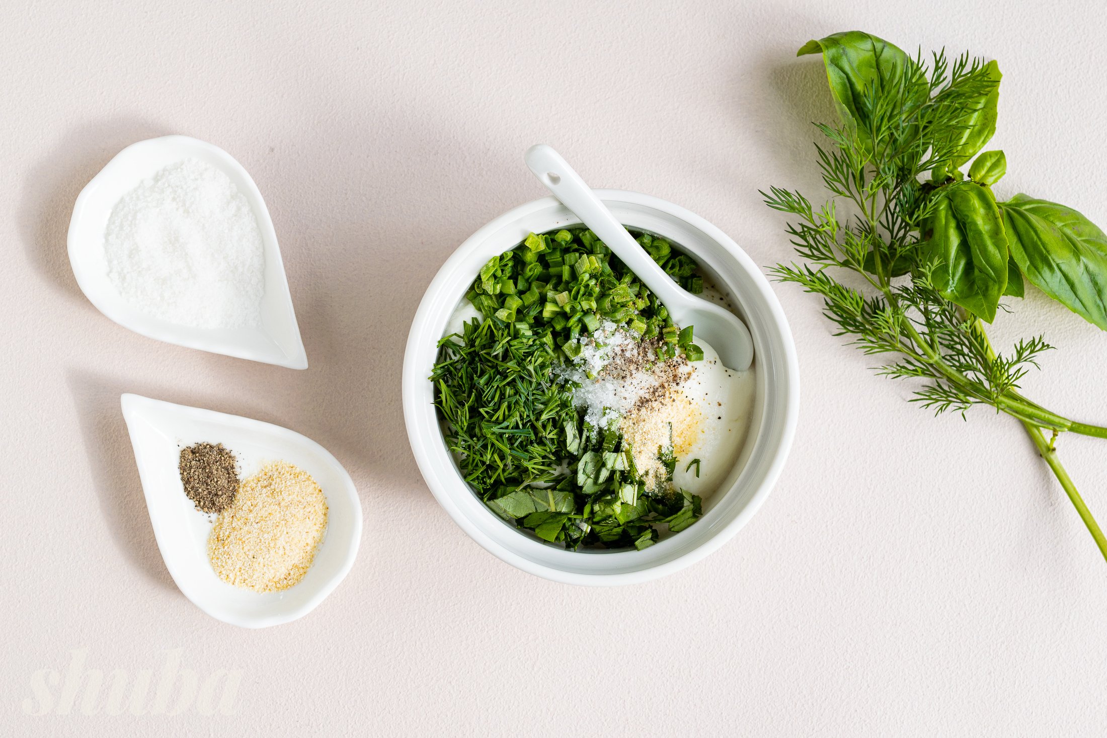 У миску додай грецький йогурт, подрібнену зелену цибулю, кріп та базилік. Додай сушений часник, сіль і чорний перець за смаком. Перемішай до однорідної кремової консистенції.