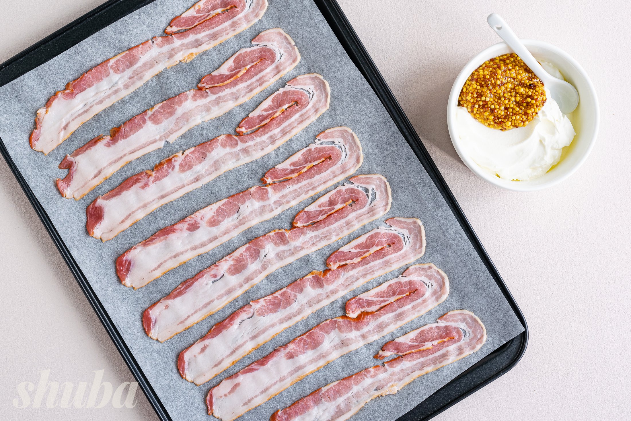 Розігрій духовку до 200 °C. Виклади бекон на деко та запікай 8-10 хвилин до хрусткої скоринки. Дістань і дай трохи охолонути. У невеликій мисці змішай жирну сметану і французьку гірчицю до однорідної консистенції.