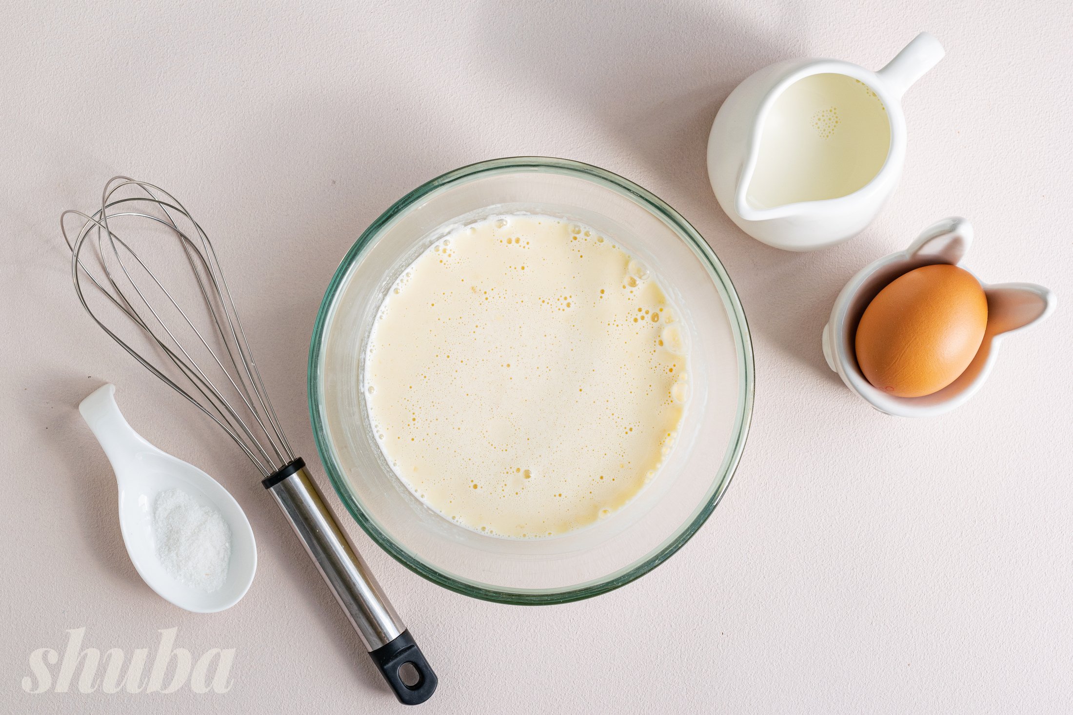 У миску всип просіяне борошно і 0,5 чайної ложки солі. Додай 1 злегка збите яйце та поступово вливай молоко, при цьому збивай вінчиком до однорідної маси без грудочок. Накрий харчовою плівкою і постав тісто відпочити приблизно на 30 хвилин.