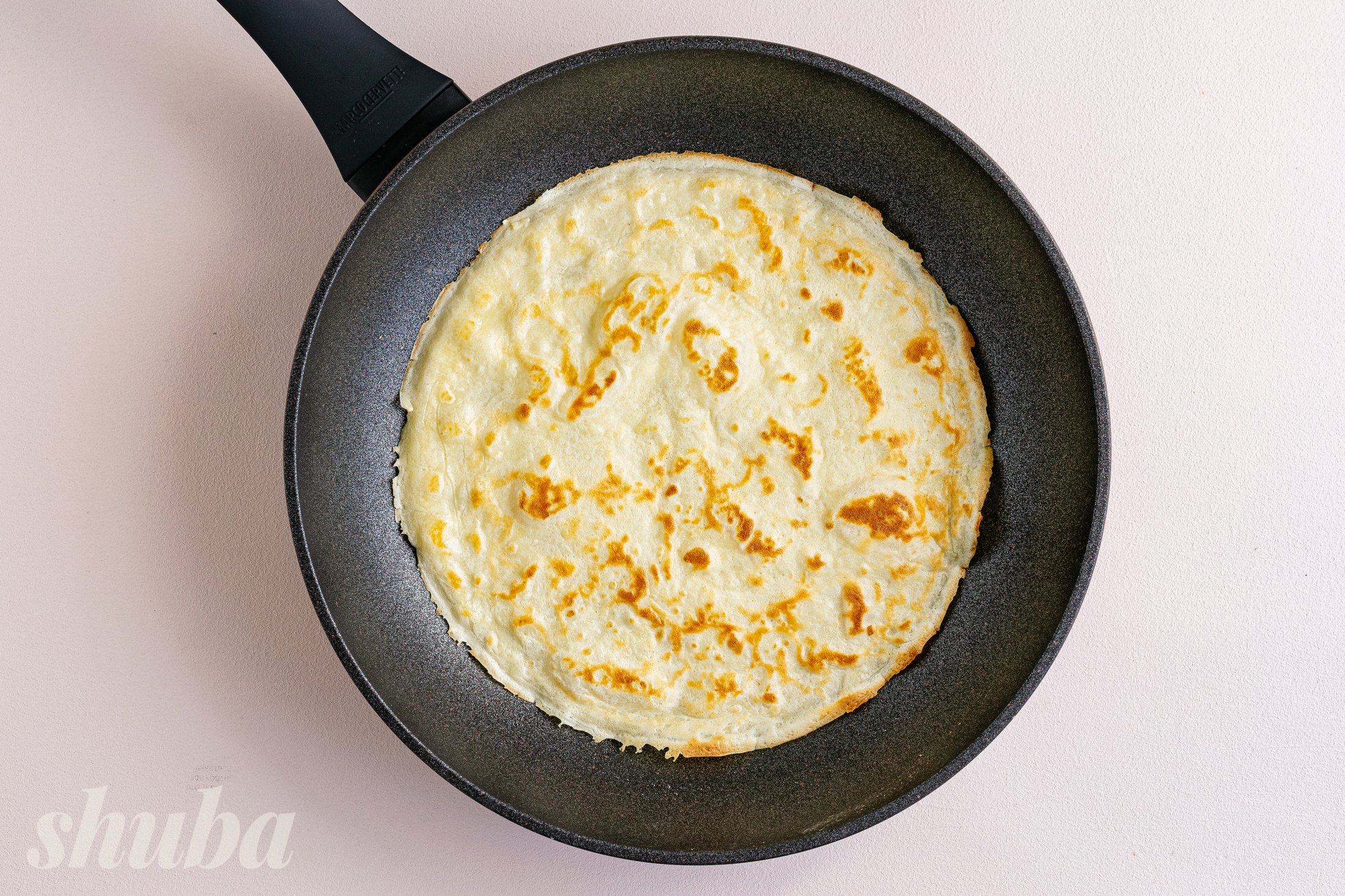 Сковороду діаметром 28-30 см змасти невеликою кількістю рослинної олії. Влий приблизно чверть тіста і розподіли його по дну тонким шаром. Смаж на середньому вогні 2-3 хвилини, переверни та підсмаж з іншого боку до золотистого кольору. Повтори з рештою тіста, щоб отримати 4 галети.