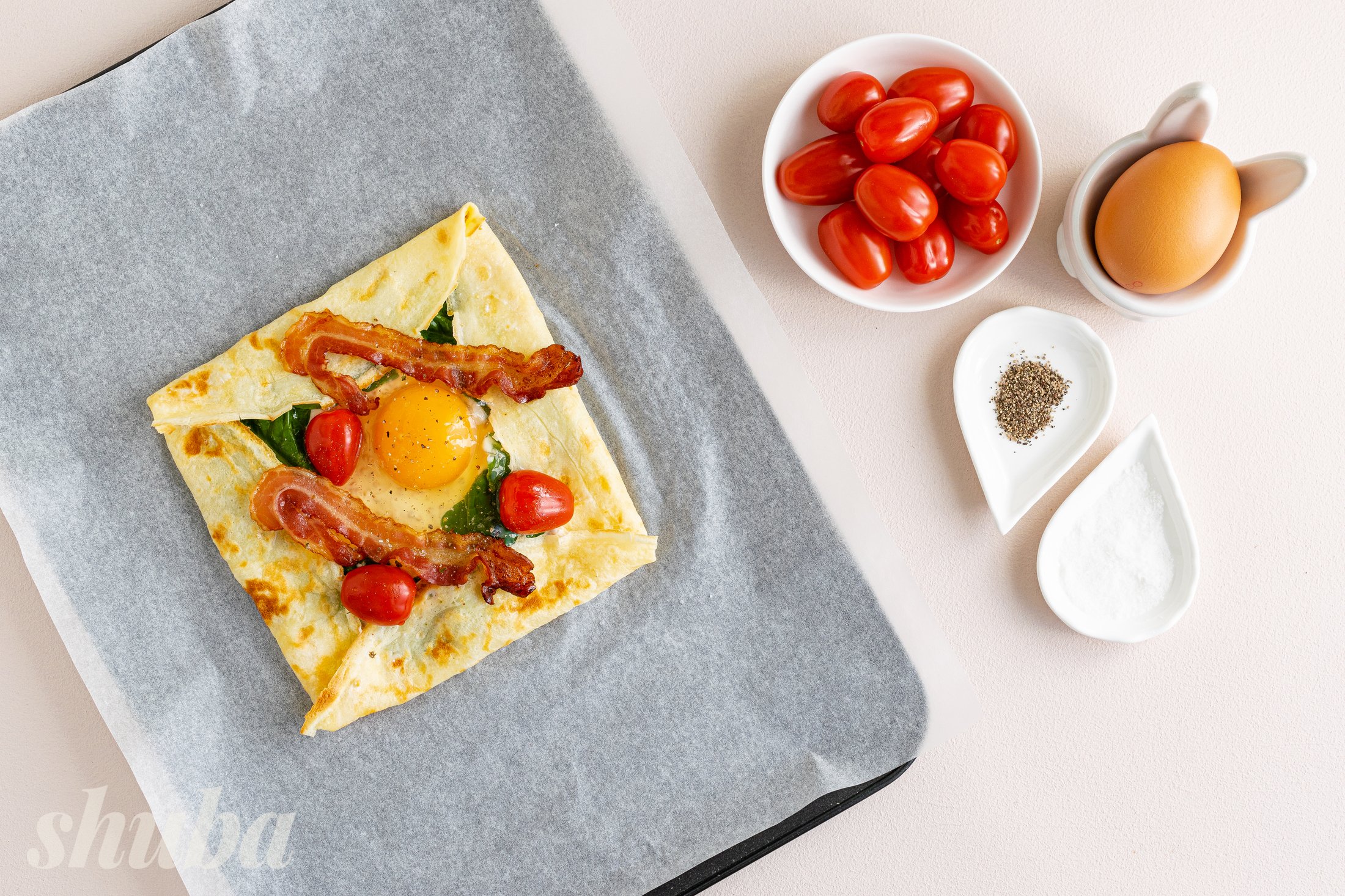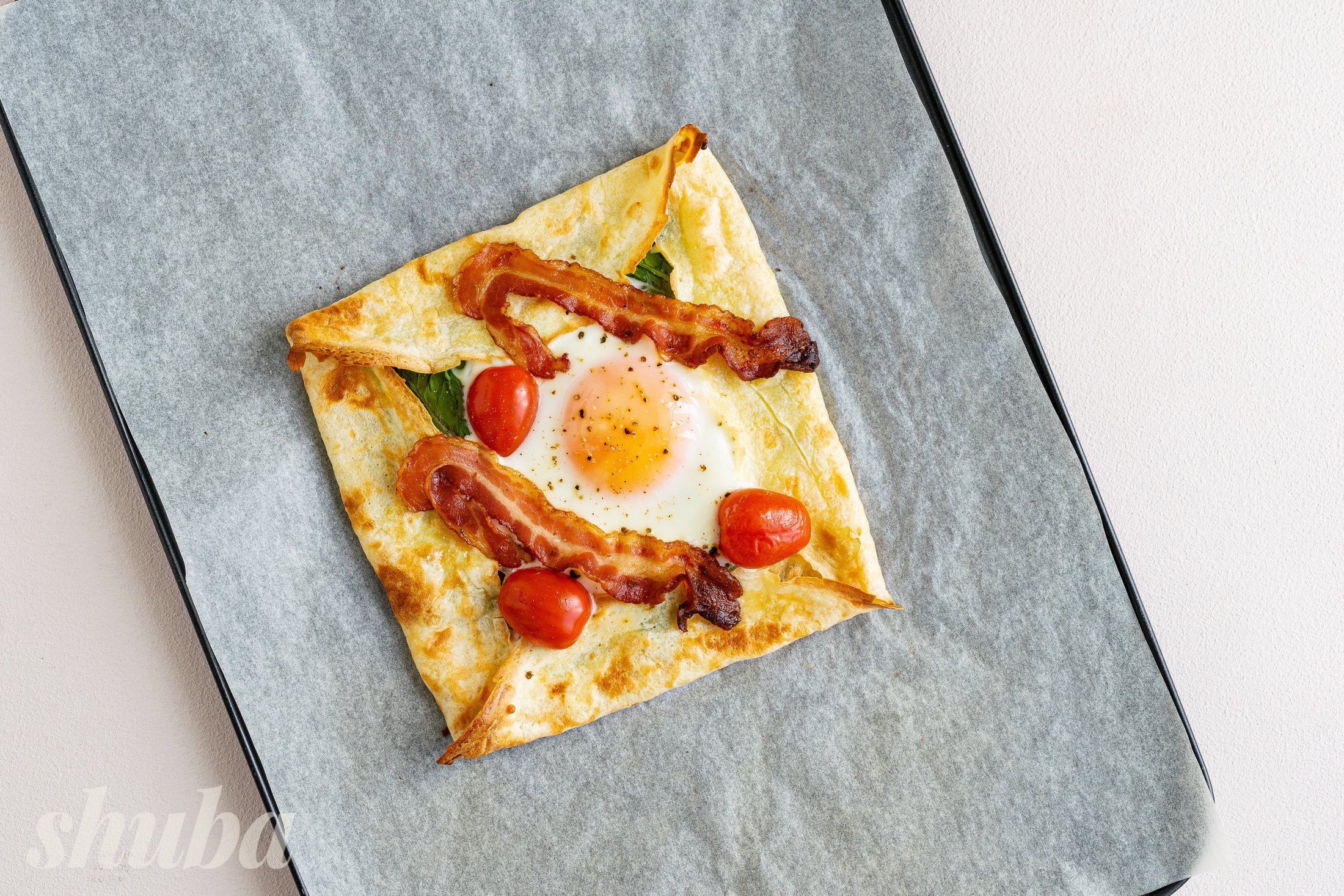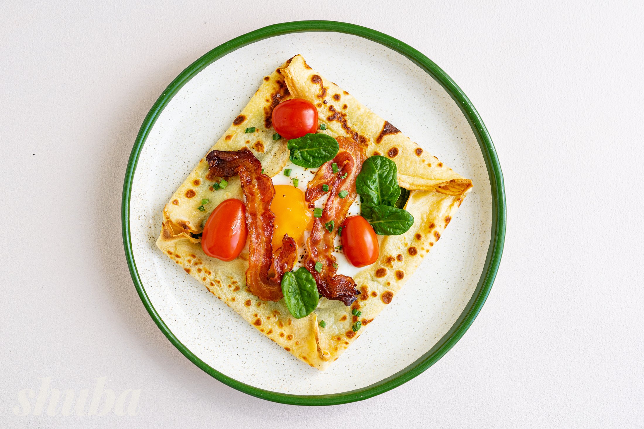 Галета з яйцем і беконом — одна з найпопулярніших варіацій. Таке поєднання створює ідеальний баланс текстур: хрусткий бекон, м’яка галета, соковиті томати та ніжний соус.
