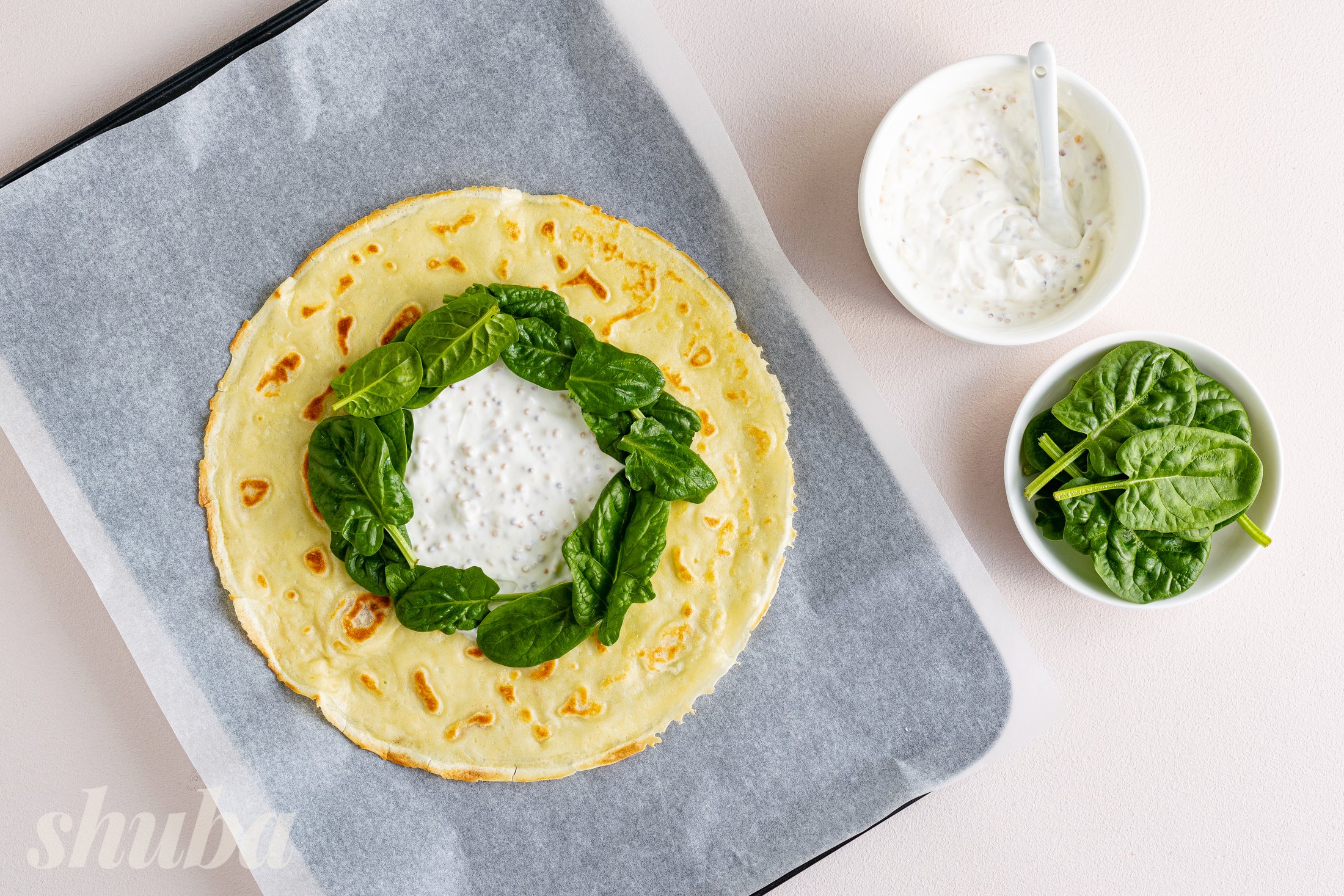 Виклади одну галету на деко. У центр поклади трохи соусу, залишай по краях приблизно 6-7 см і розклади шпинат.