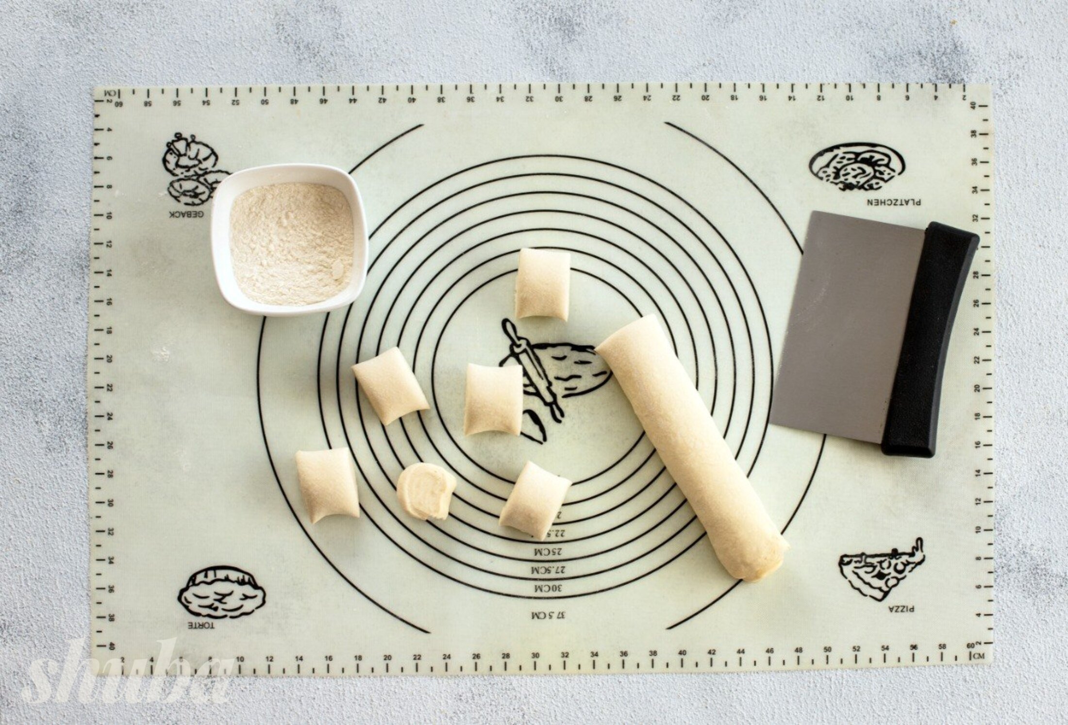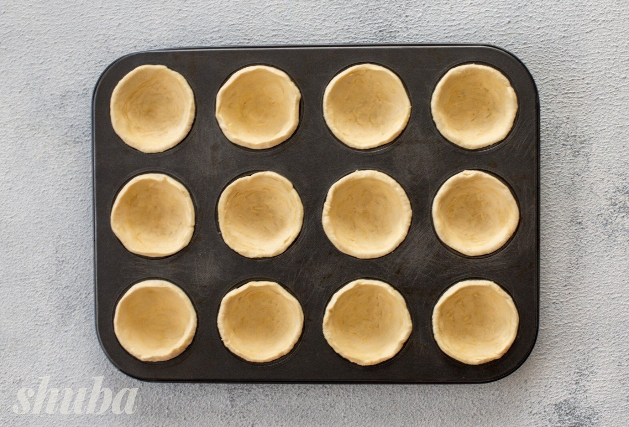 Розкатай листкове тісто в прямокутник приблизно 40×30 см. Скрути щільним рулетом і наріж на 10–12 шматочків. Виклади у форму для кексів і постав у холодильник.