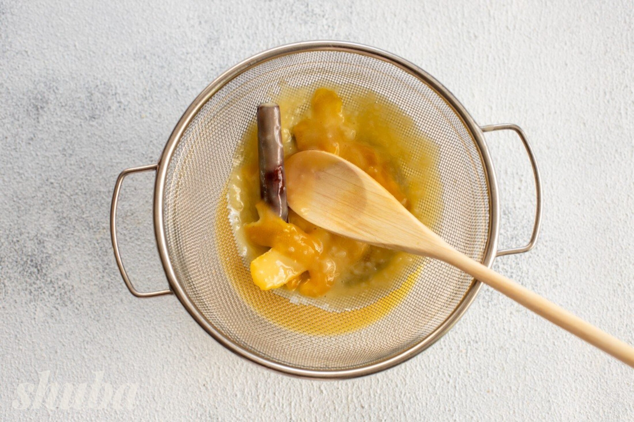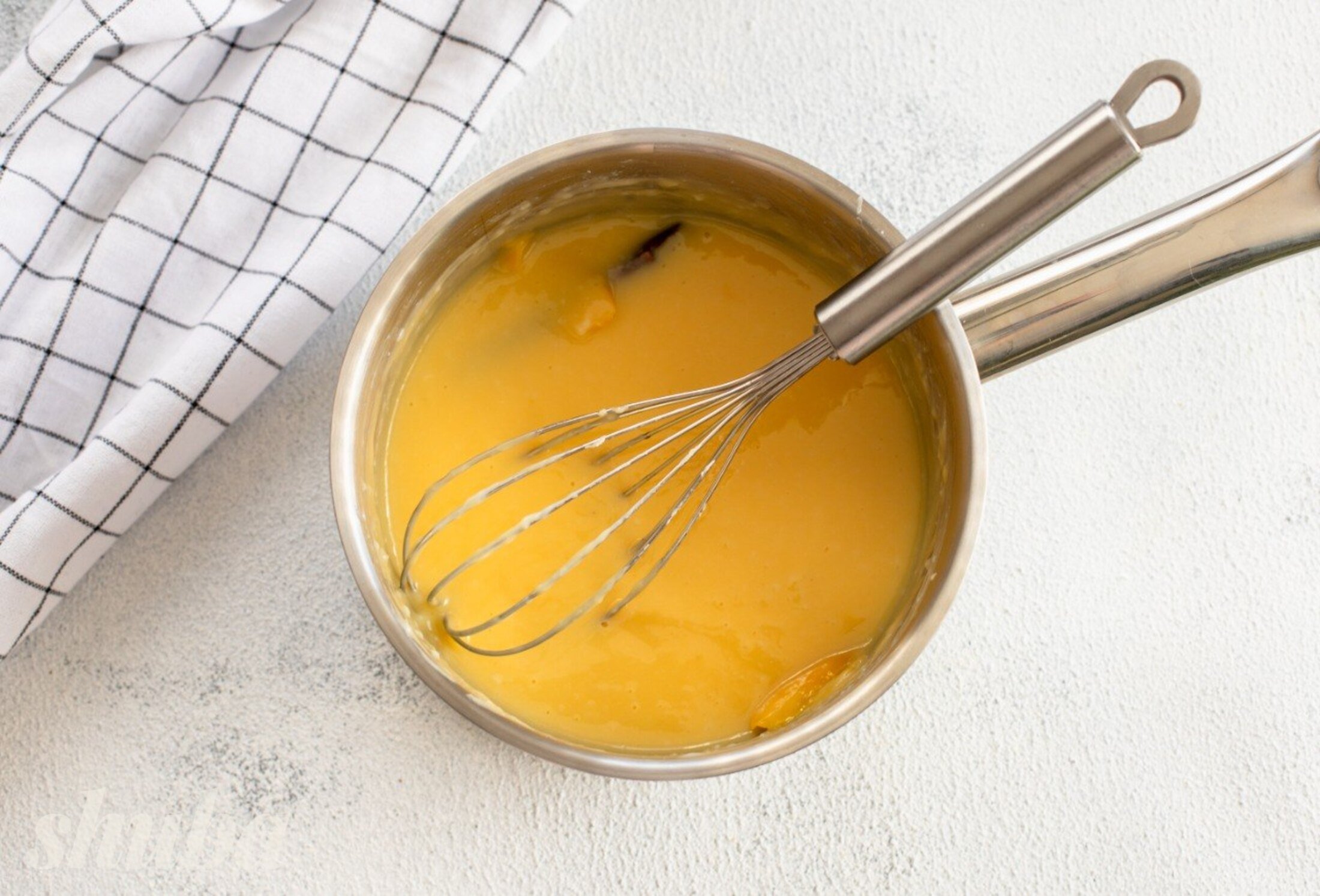 Тонкою цівкою влий сироп у молочну суміш, при цьому постійно помішуй. Відділи жовтки і додай їх у трохи охолоджену масу. Перемішай до однорідності і проціди через сито.