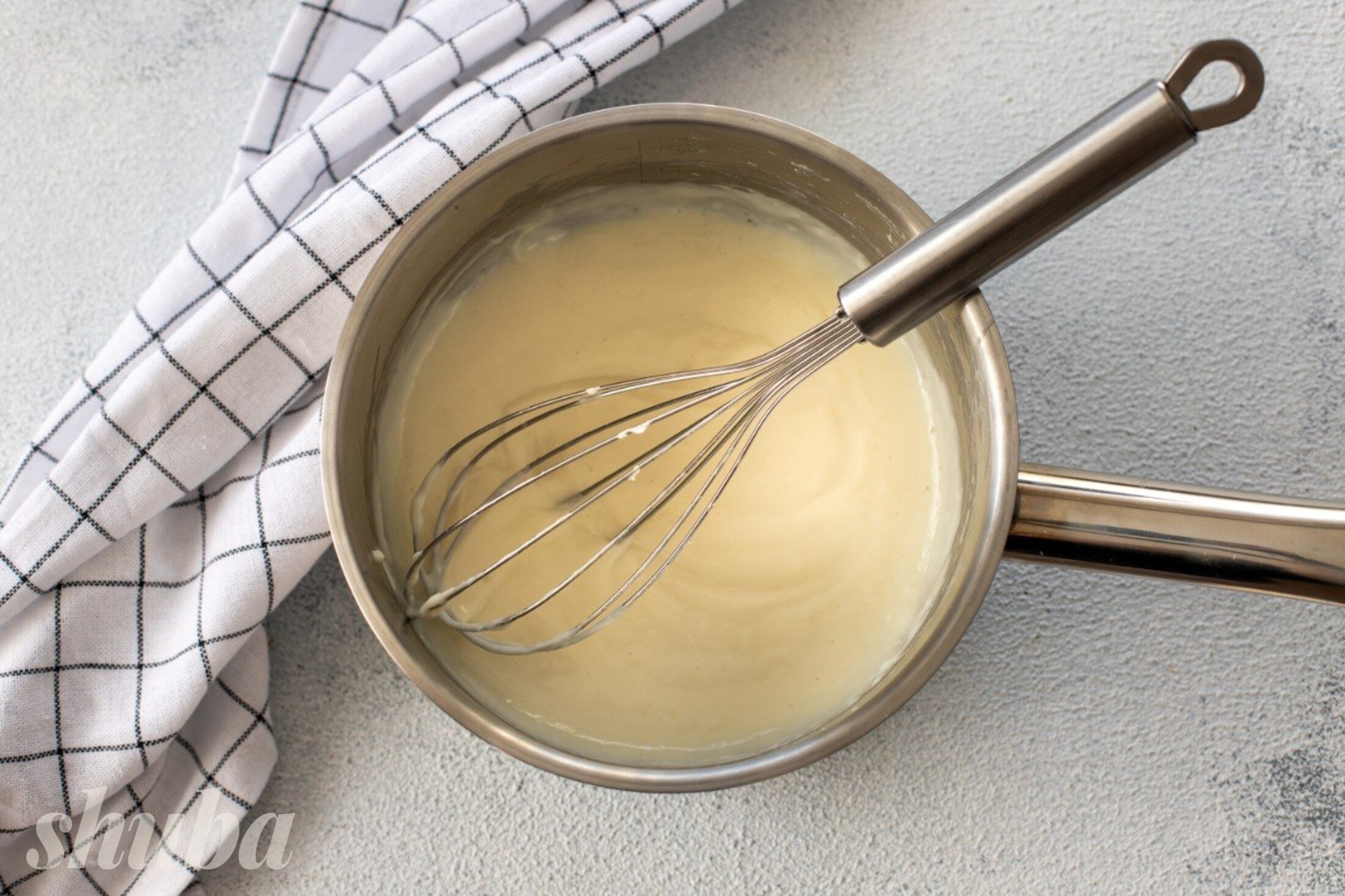 Змішай борошно із 30 мл молока до однорідності без грудочок. Додай решту молока і нагрівай, постійно помішуючи, поки суміш злегка не загусне. Зніми з вогню.