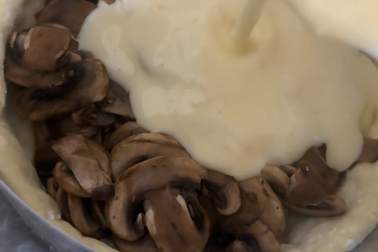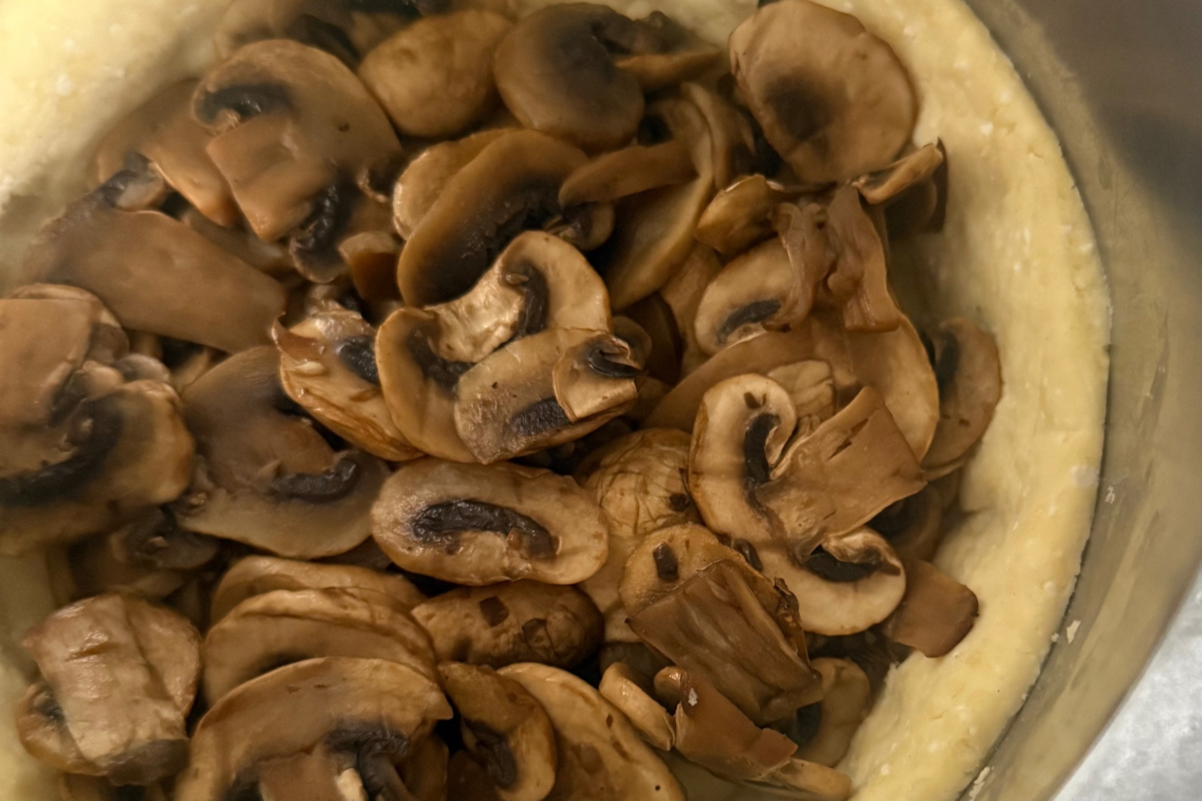 Авторка рецепта кіша з грибами обсмажує печериці на воді до м’якості. Жирність корисного грецького йогурту — твій вибір. Ти також можеш збагатити начинку та зробити сирний кіш з грибами.