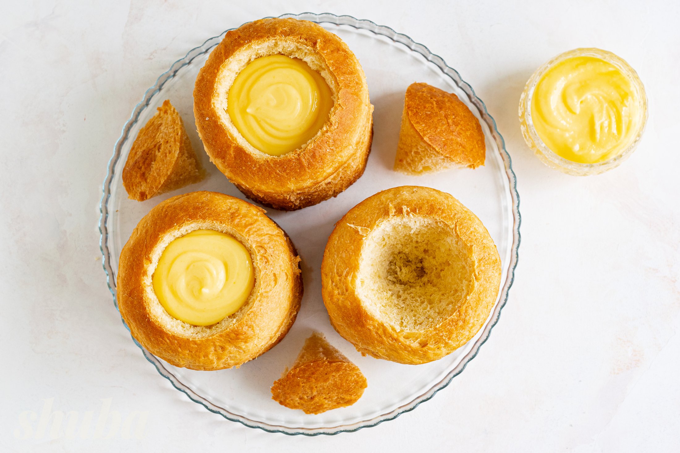 Коли паски повністю остигнуть, зверху акуратно виріж середину і заповни її лимонним курдом. Накрий курд шапочками тіста.