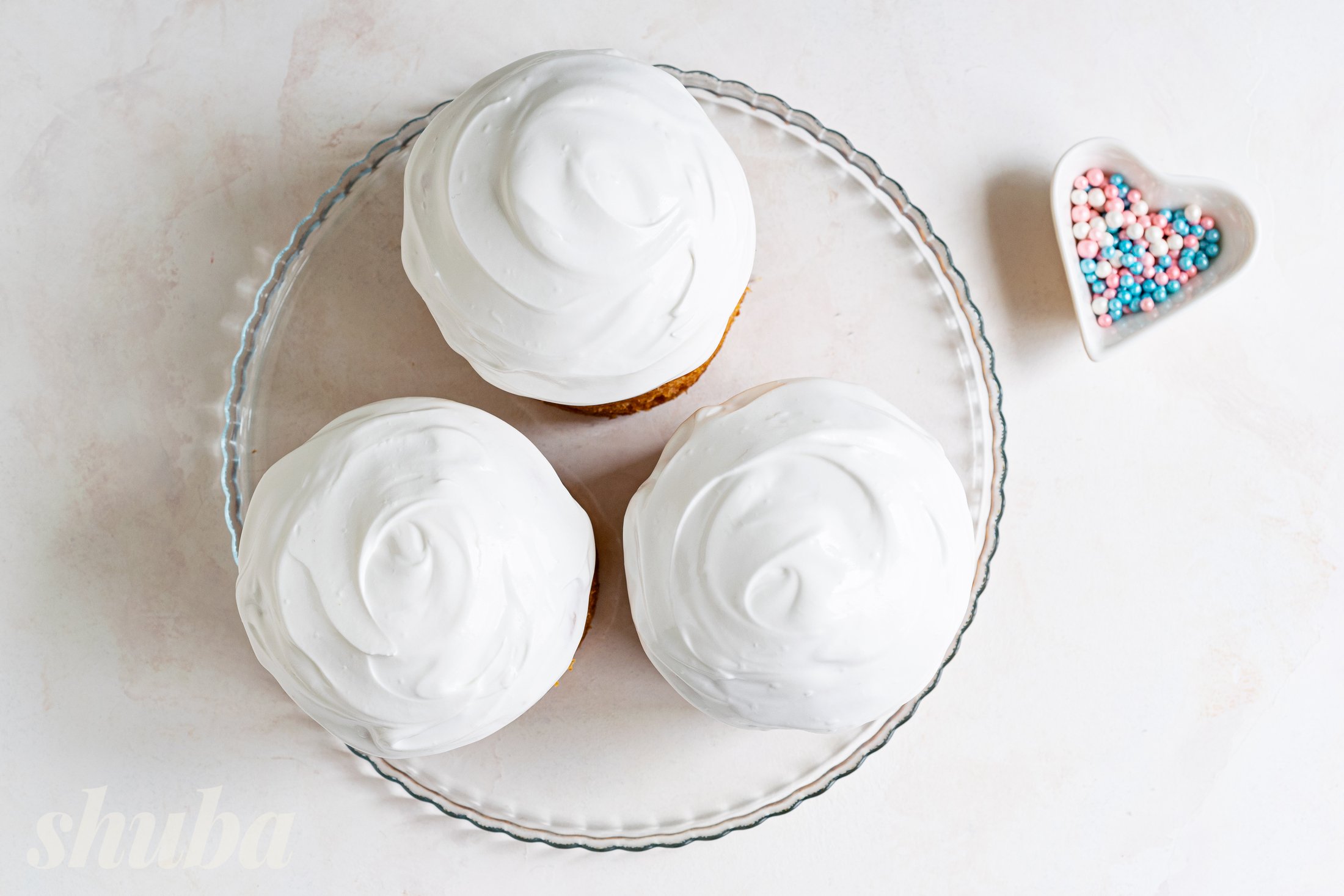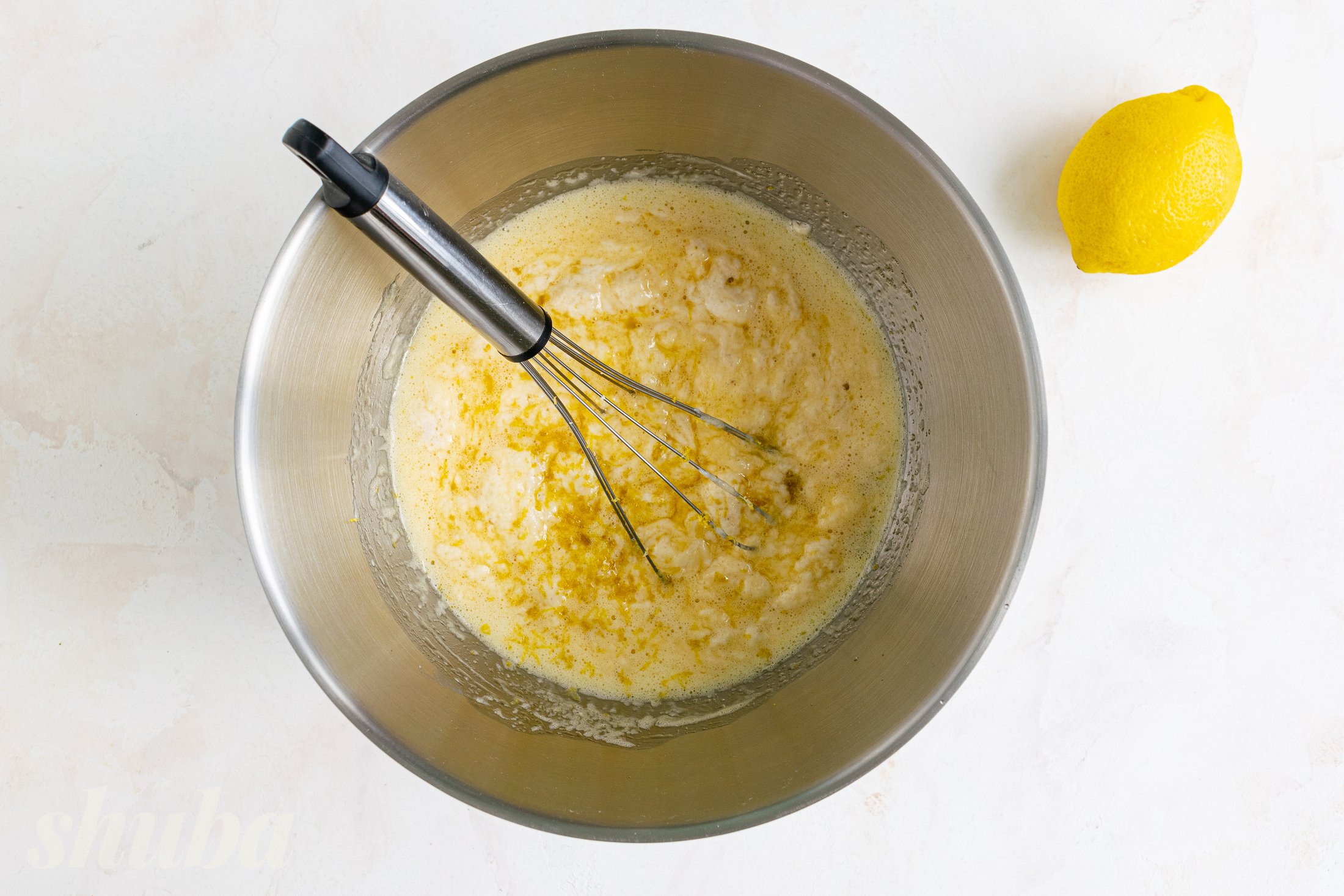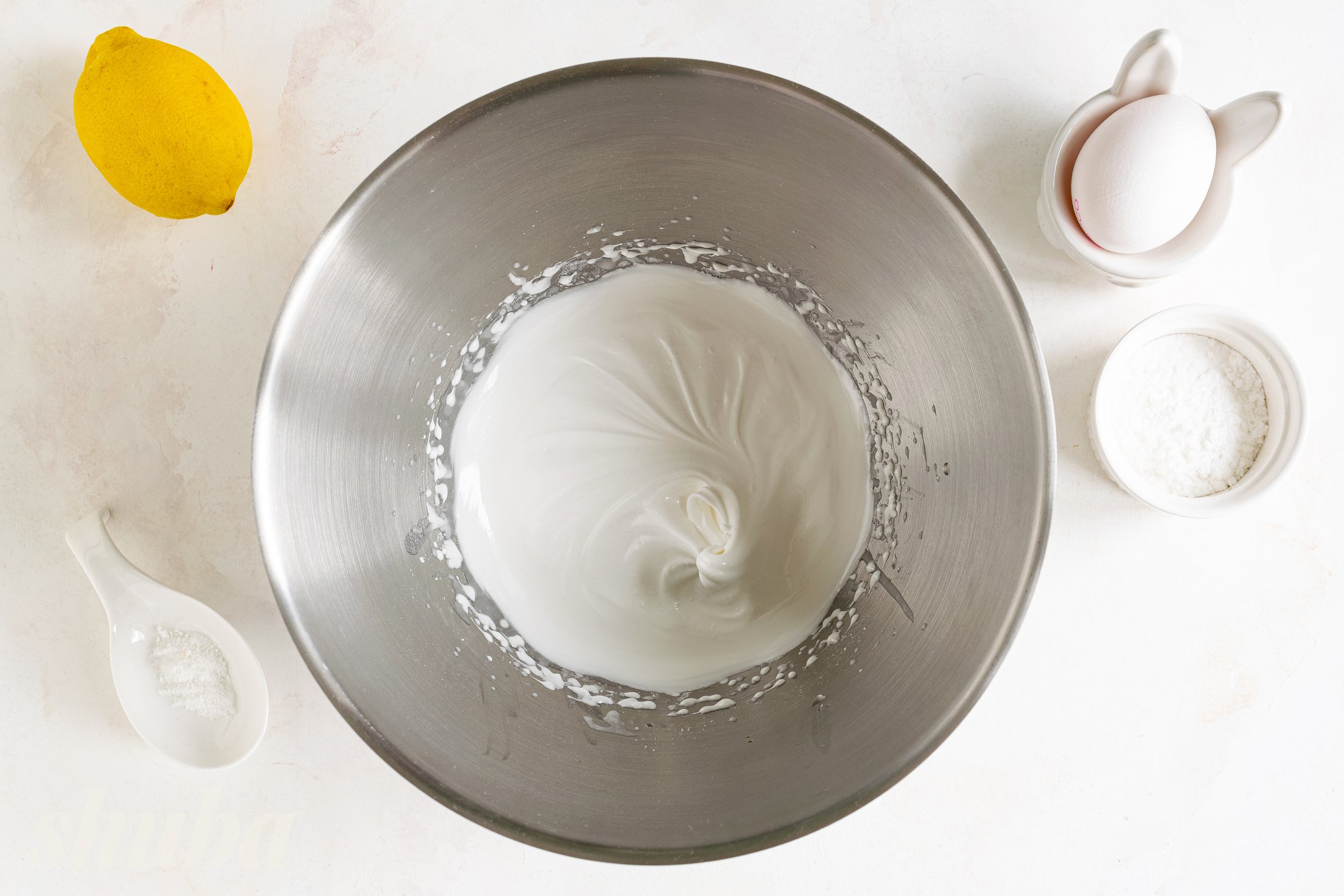 Збий білки з лимонним соком, цукровою пудрою та ванільним цукром на максимальній швидкості міксера до густої блискучої маси.