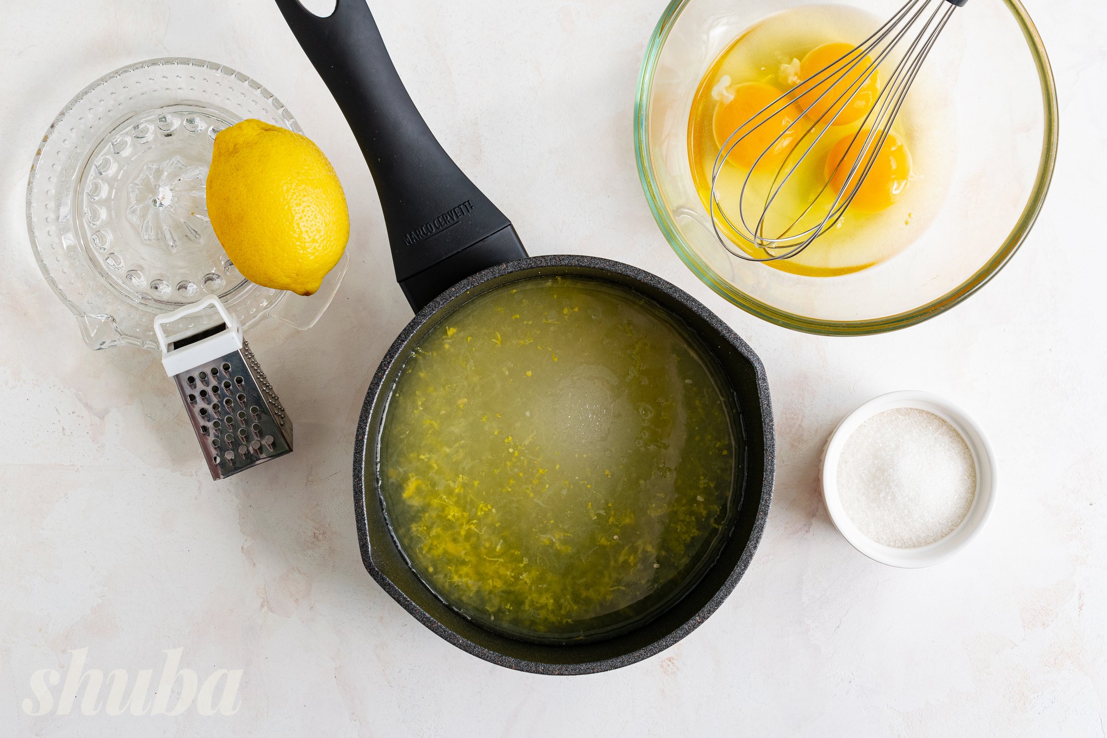У ковші змішай цукор, лимонний сік і цедру, постав на слабкий вогонь і провари суміш до початку кипіння. В окремому посуді збий вінчиком курячі яйця.