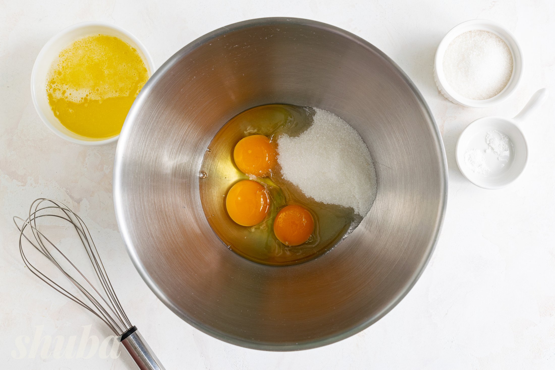 Яйця та 1 жовток збий вінчиком із цукром, сіллю та ванільним цукром до світлої маси. Вершкове масло розтопи на плиті або в мікрохвильовці, остуди до кімнатної температури.