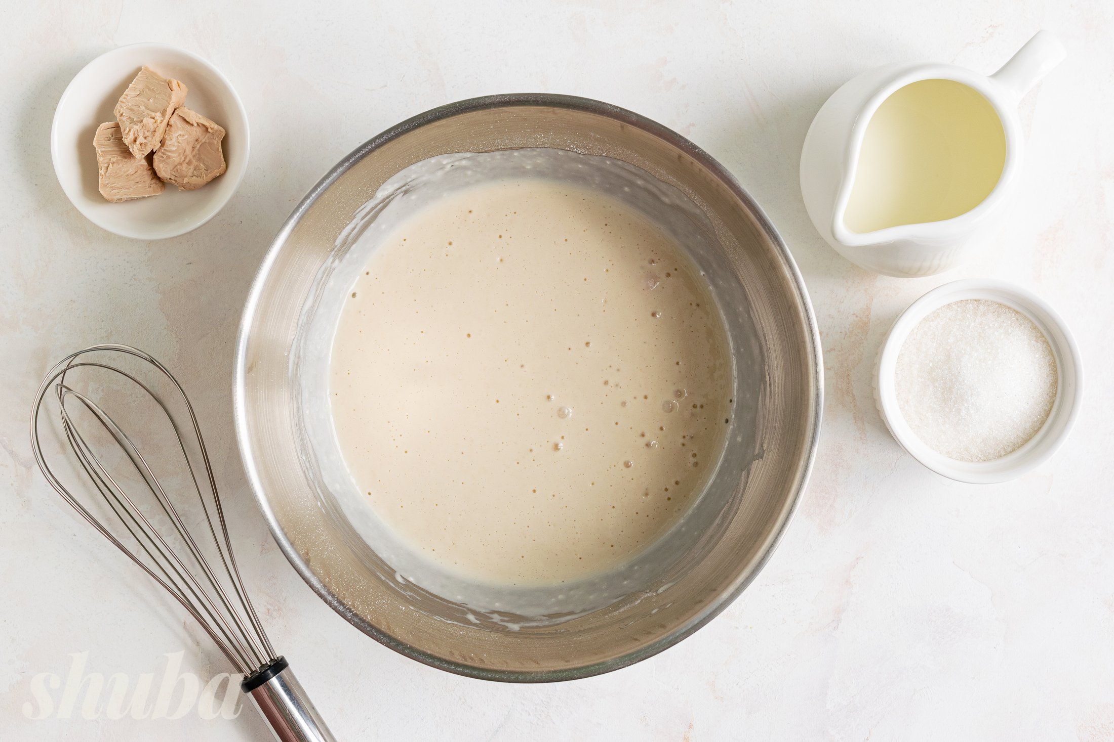 Змішай тепле молоко з дріжджами та цукром, додай борошно і перемішай до однорідності. Залиш у теплому місці на 30-40 хвилин, щоб опара піднялася.