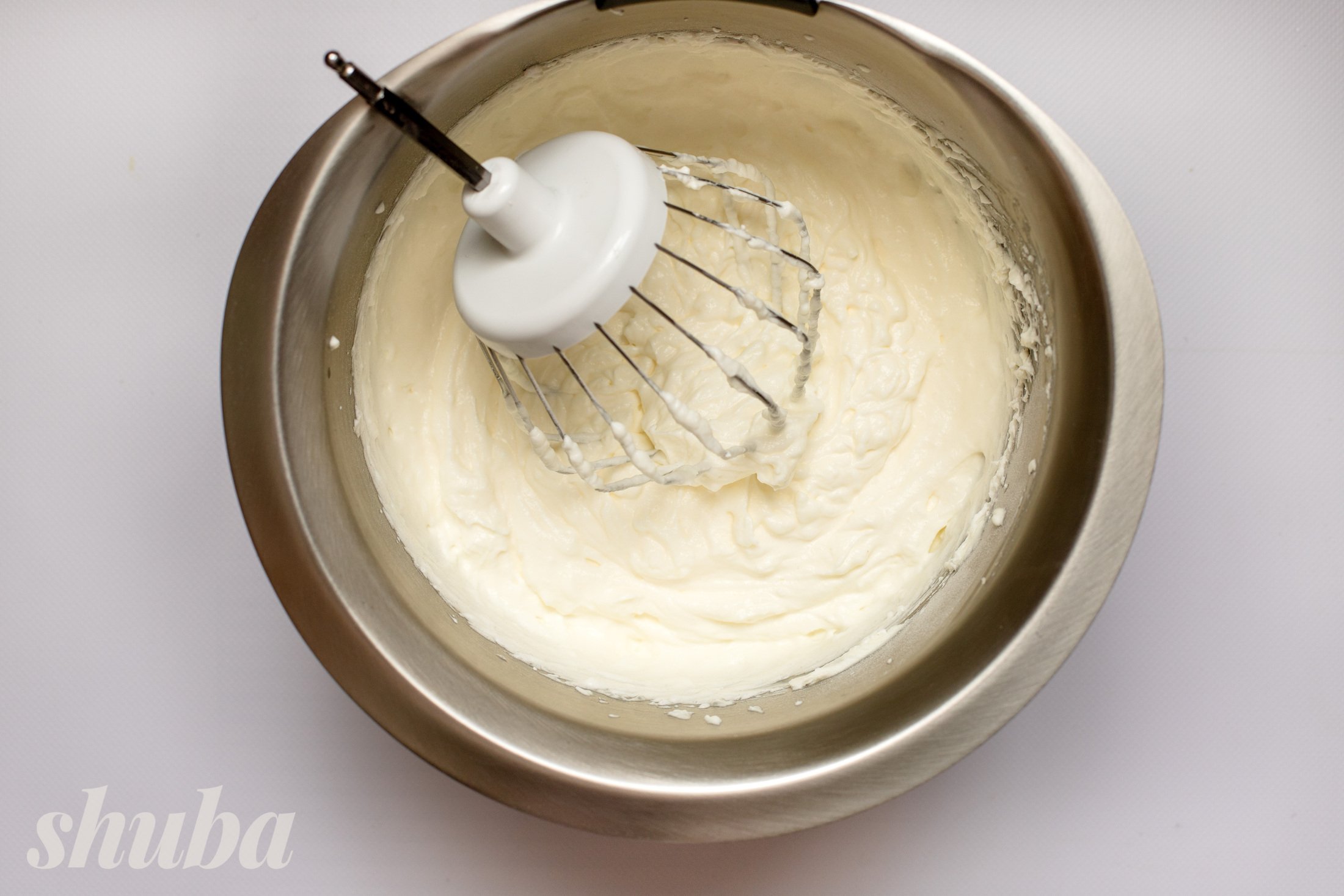 Для крему сметану (600 г) перелий у глибоку миску, додай цукор (150 г) і ванільний цукор (10 г). Збий міксером до розчинення цукру. Додай загущувач для сметани або вершків (12 г). Ще раз перебий міксером до загустіння.