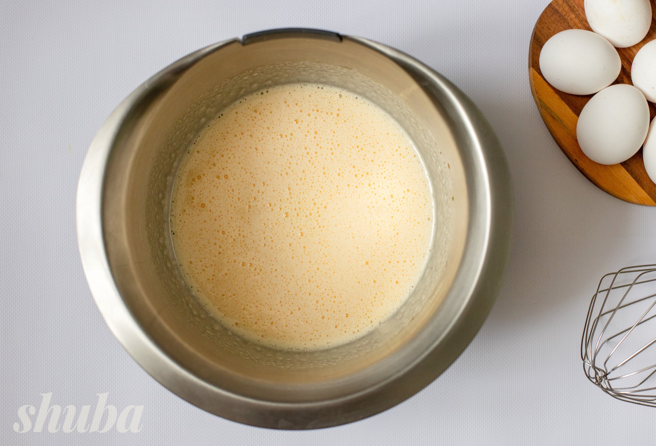 Для білого коржа у миску розбий яйця (2 шт.), додай дрібку солі та цукор (120 г). Добре збий міксером до пишної піни.