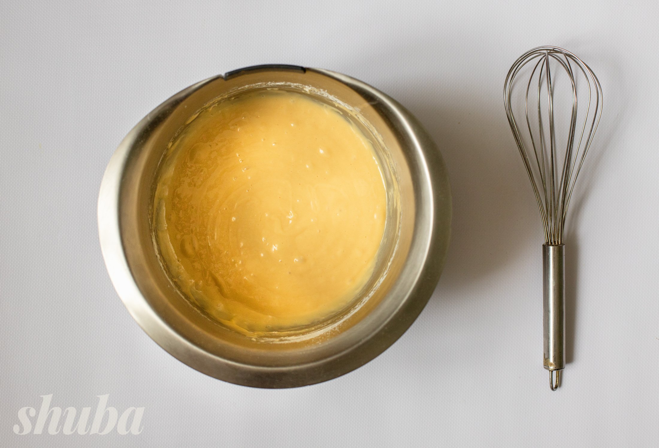 Поєднай сметанну масу з яєчною і перемішай до однорідності. Додай борошно (180 г) і ретельно перемішай. Потім додай олію (2 ст. л.) і ще раз перемішай до однорідності. Розігрій духовку до 180 °C. Форму діаметром 20 см ретельно змасти вершковим маслом або олією. Перелий світле тісто у форму й випікай 30 хвилин. Готовність коржа перевір шпажкою — вона має виходити сухою.