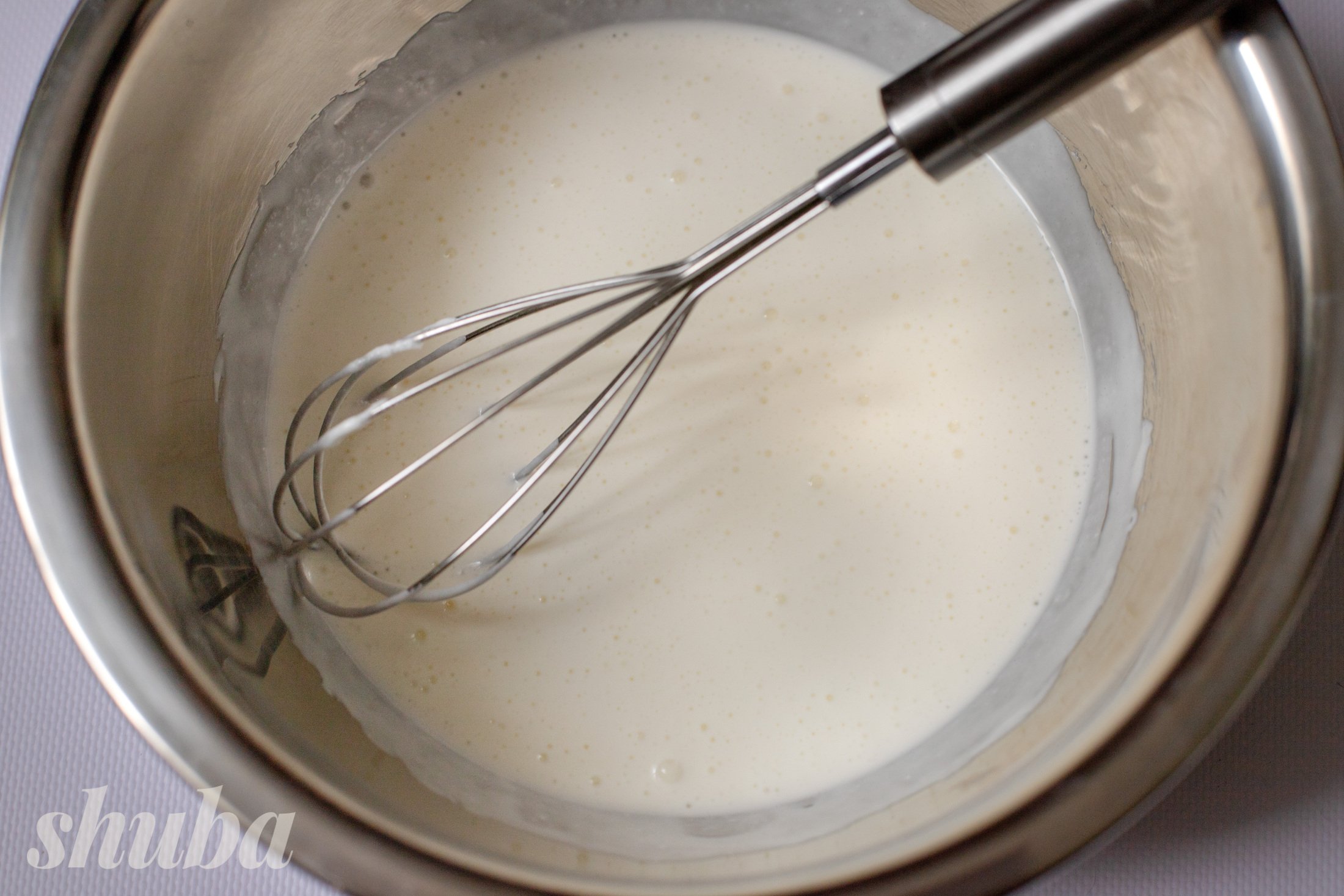 В іншу миску виклади сметану (130 г), додай соду (1 ч. л.) і перемішай. Сметана збільшиться в об’ємі.