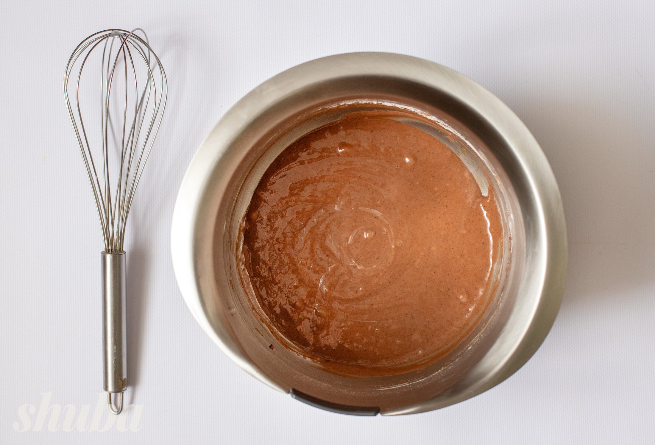 Шоколадний корж приготуй так само, як білий, але візьми менше борошна: 160 г. Додай до тіста 2-3 ст. л. какао і перемішай до однорідності.