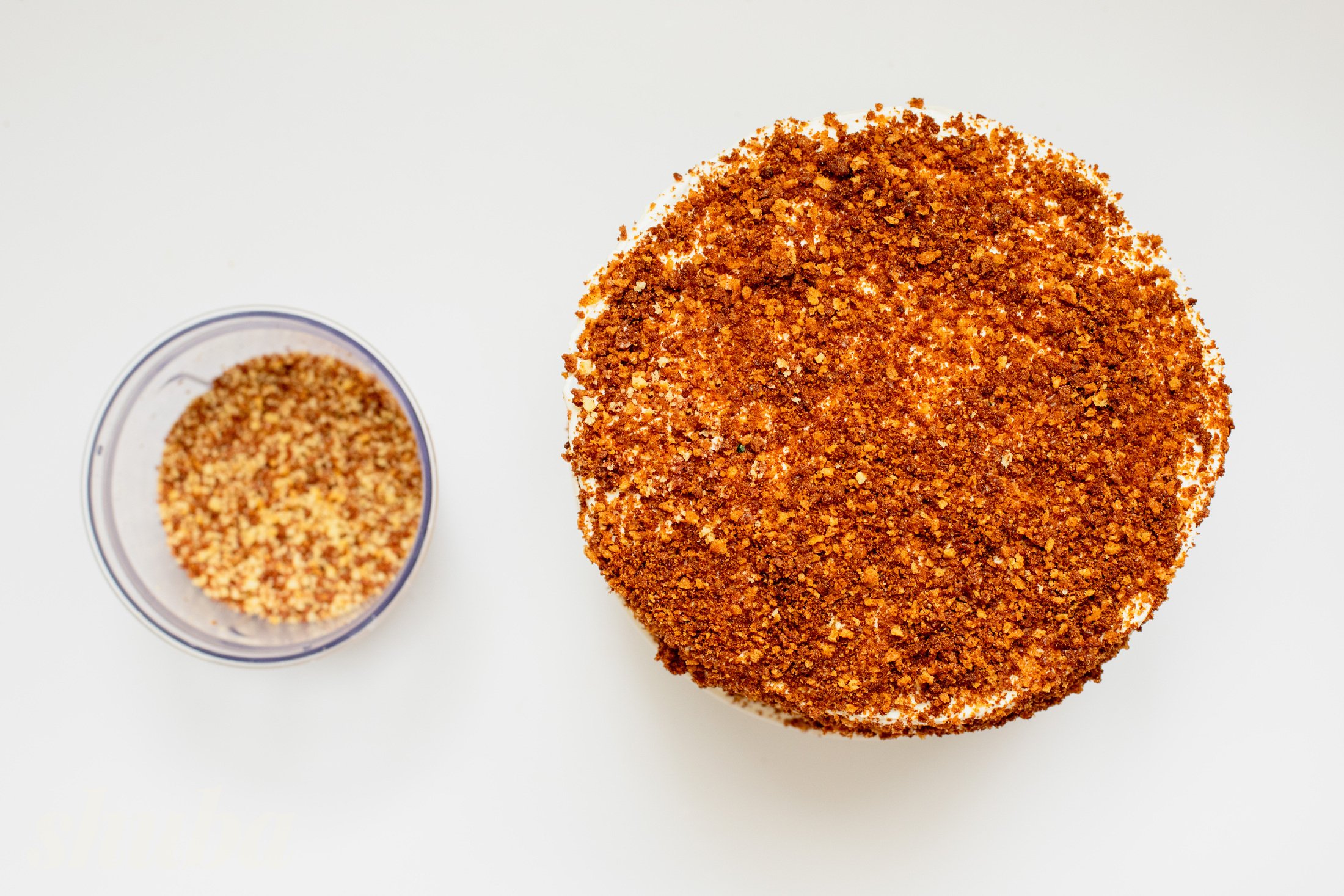 Верх і боки торта намасти кремом. Обрізки перебий у блендері в крихту. Посип ними сметанник. Відправ торт у холодильник настоюватися на ніч.