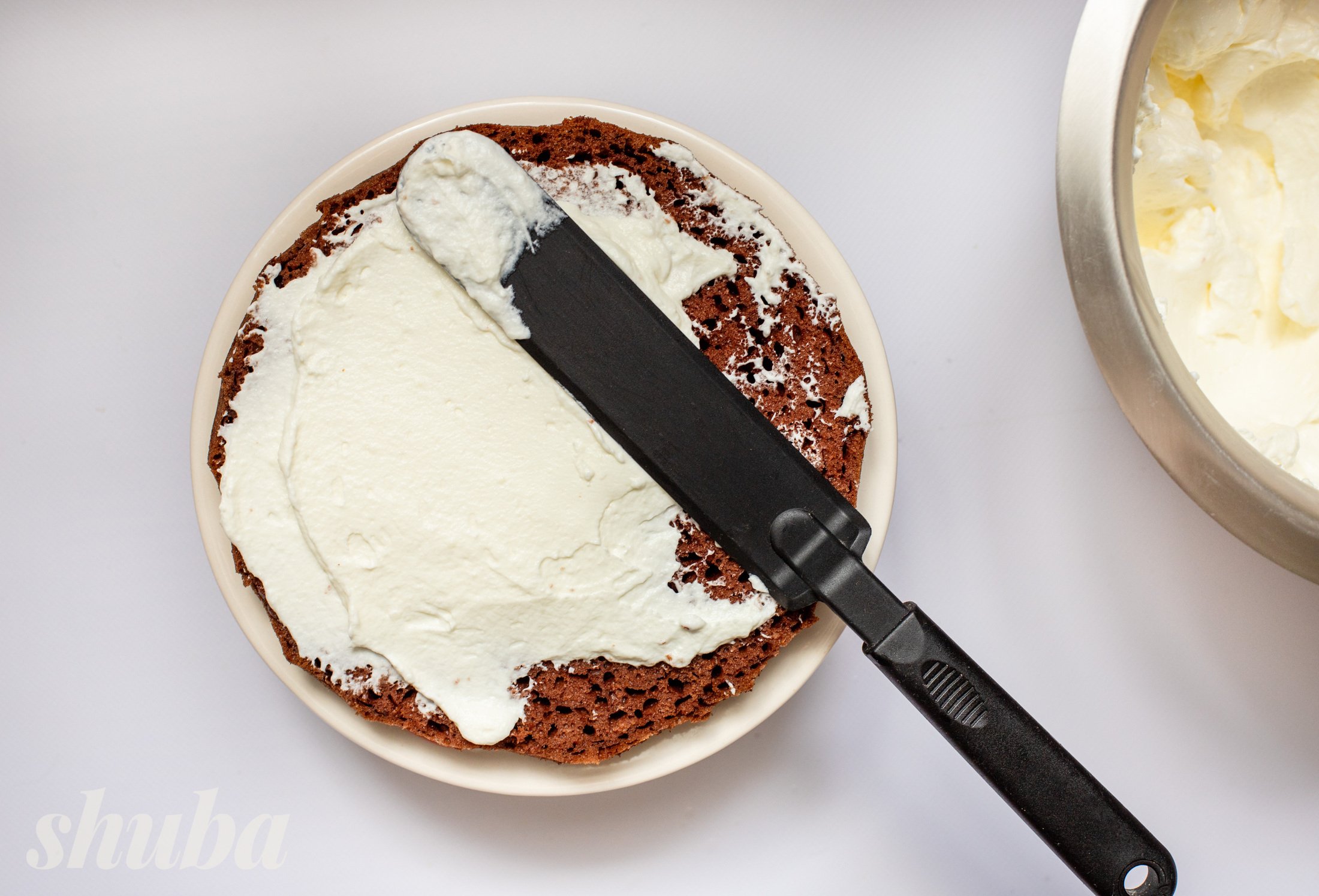 На дно блюда виклади шоколадний корж. Намасти його кремом. Зверху виклади білий корж і так само намасти кремом. Потім виклади ще один шоколадний корж, а зверху — ще один білий.