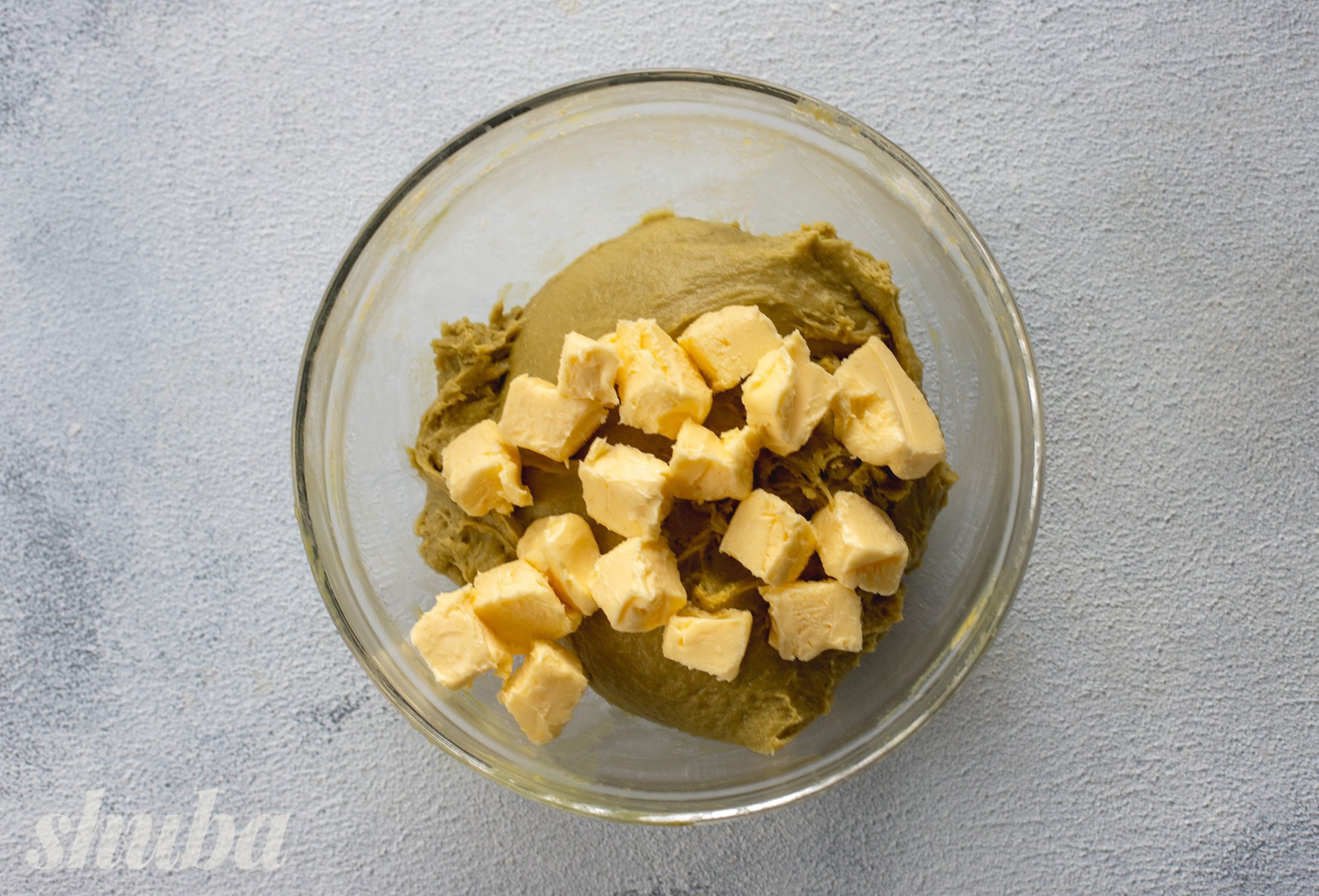 З’єднай опару з жовтками. Додай мед, поступово введи борошно і вимішуй тісто 10 хвилин. Потім додай м’яке масло і влий ром.