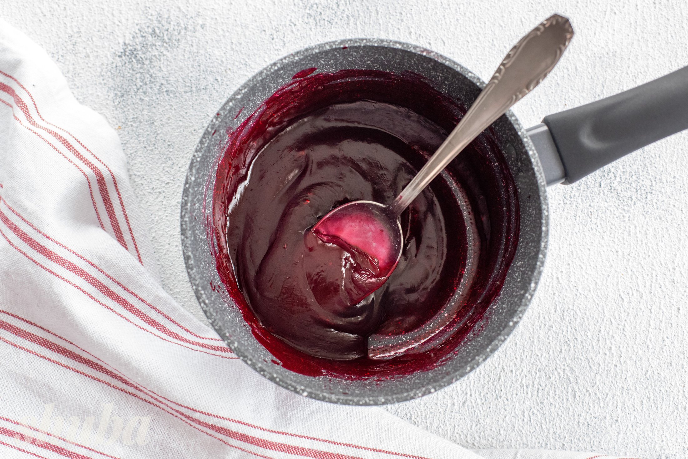 Прогрій малину з 15 мл води до появи соку. Додай цукор, перемішай. Крохмаль розведи у 30 мл води, влий і вари до загустіння.
