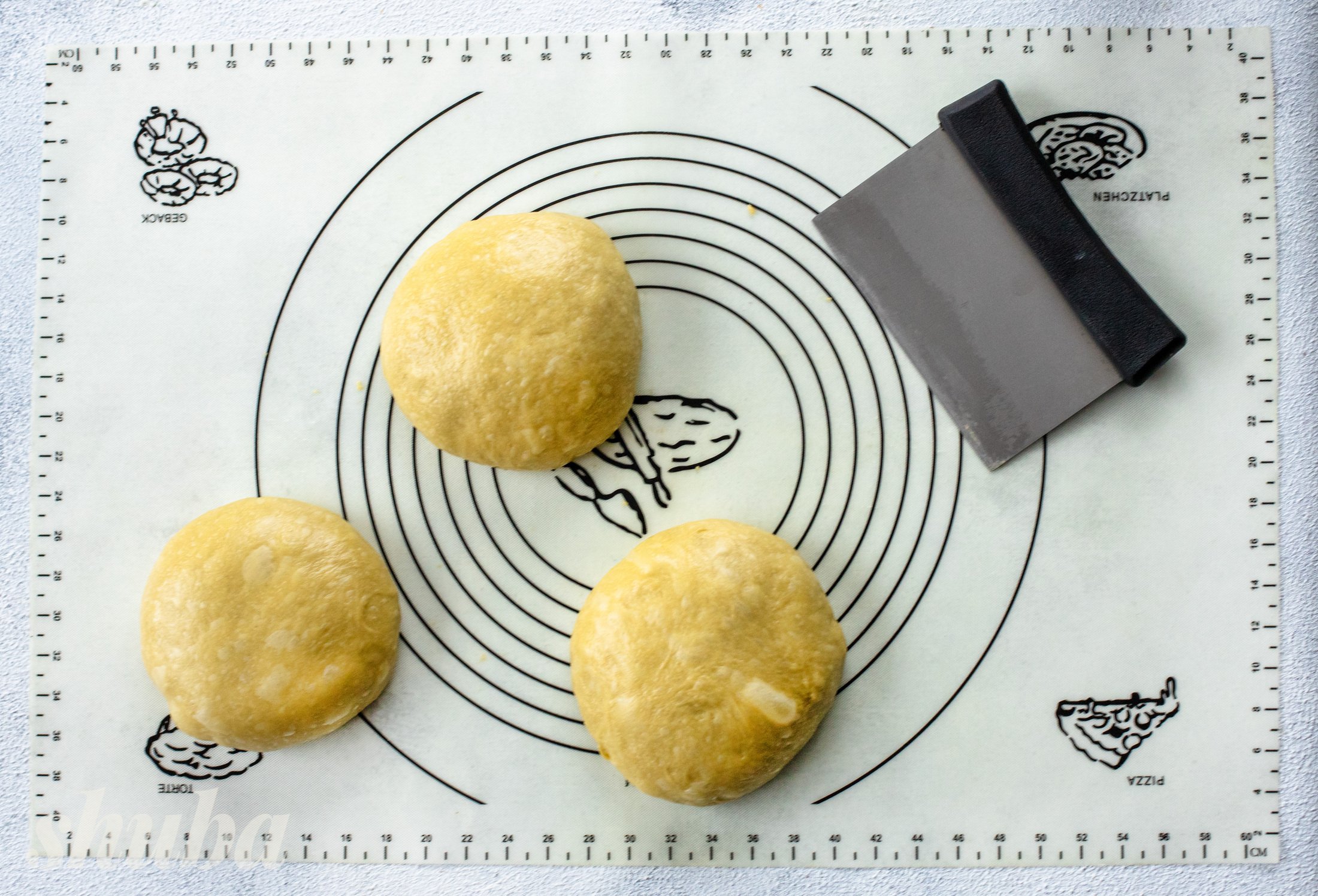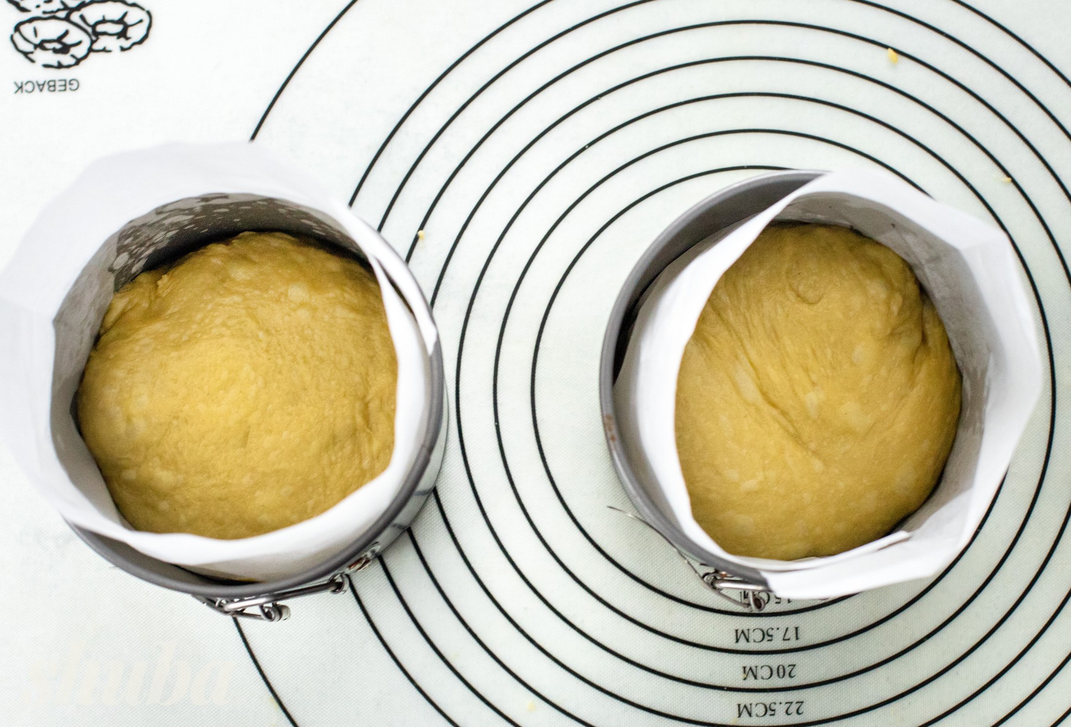 Сформуй кульки. Виклади у форми (13 см діаметр, від 10 см висота), заповнюючи на ⅓. Дай підійти до майже повного об’єму.