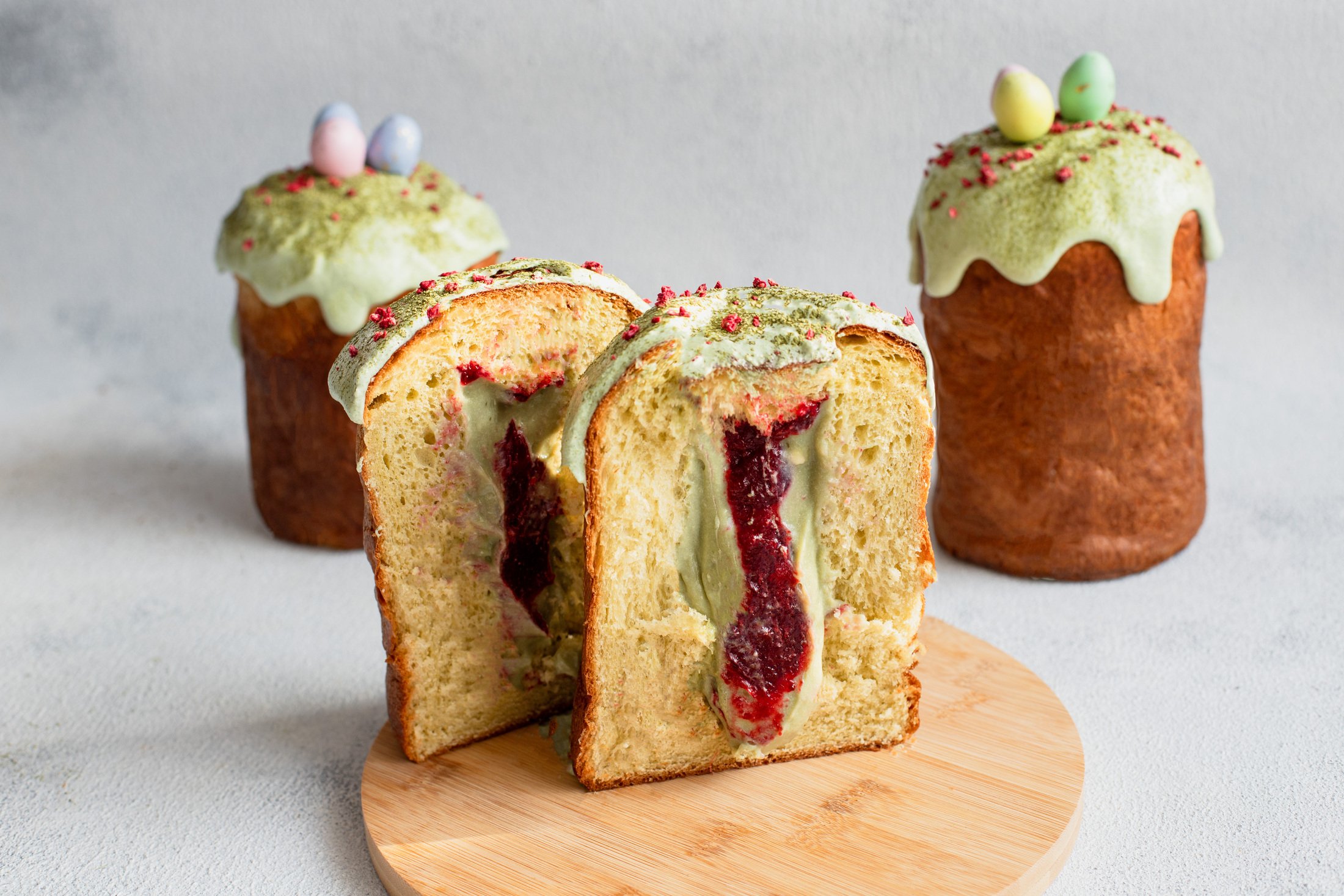 Паска з матчею і малиною — це сучасний рецепт святкової випічки з ніжною текстурою та яскравою начинкою всередині. Паска на дріжджовому тісті з ромом випікається до легкої скоринки, а потім наповнюється матча-кремом і малиновим конфі.