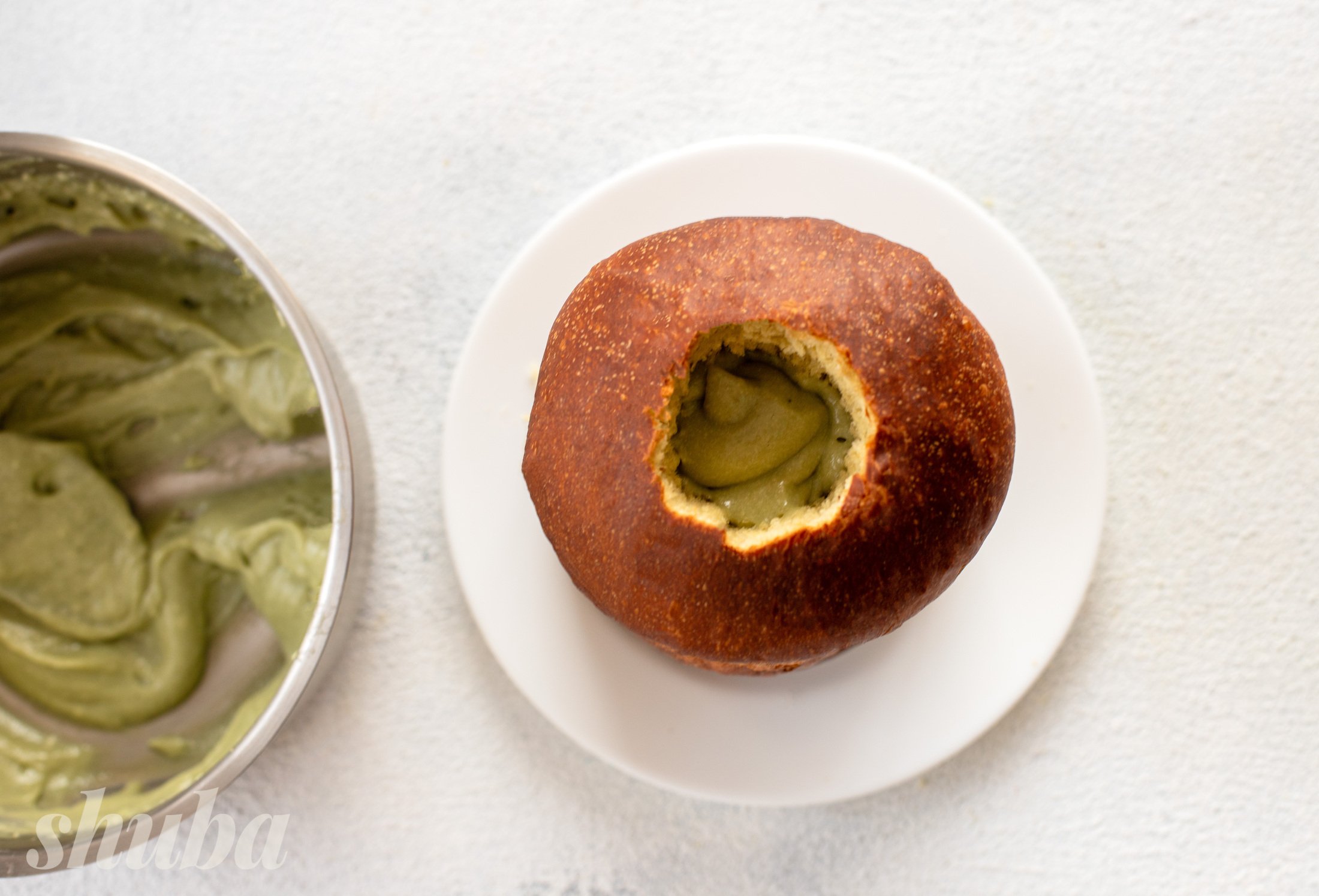Виріж у кожної паски серединку. Заповни матча-кремом, а всередину додай малинове конфі. Закрий «кришечкою».