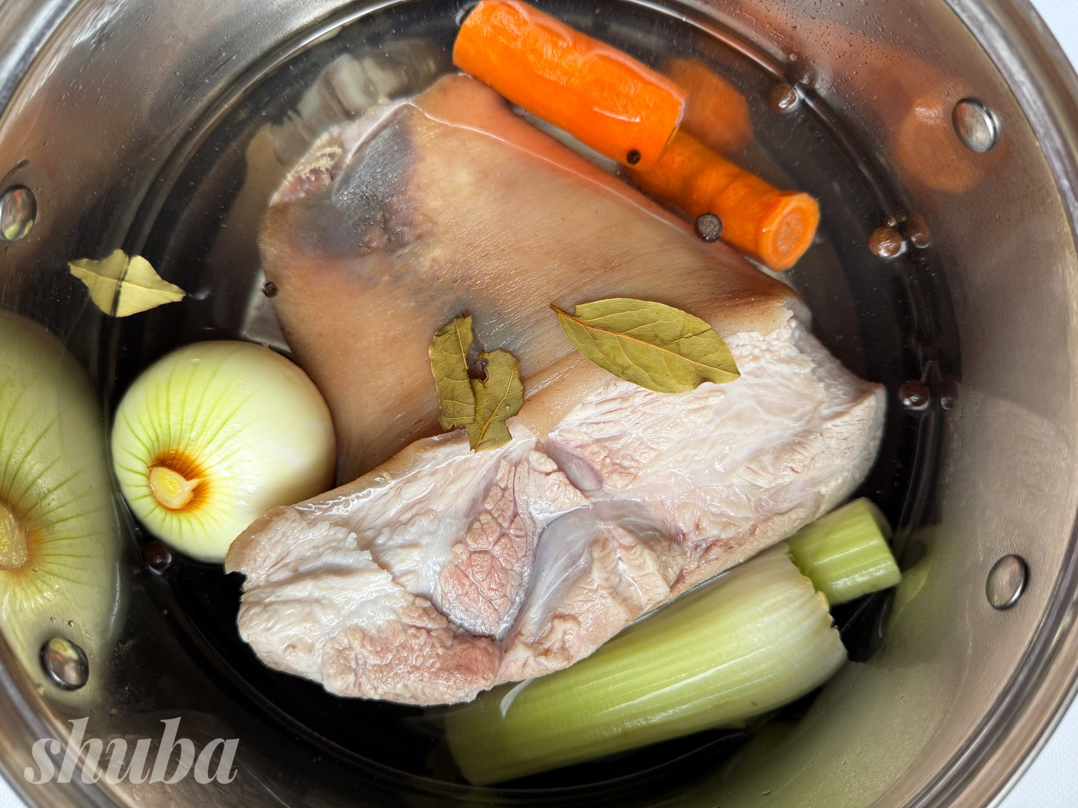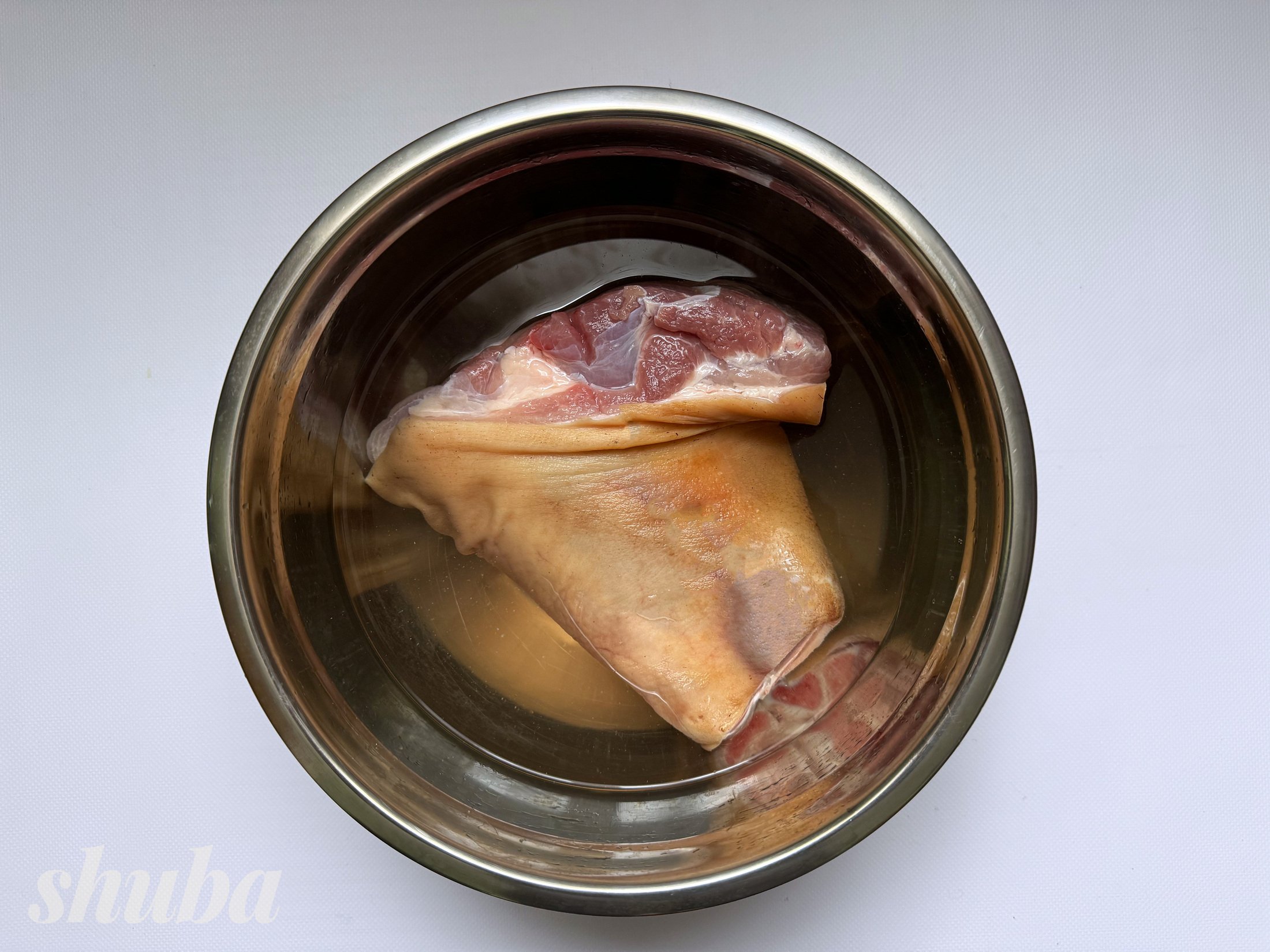 Добре помий рульку, пошкреби ножем, щоб прибрати залишки бруду. Замочи у холодній воді на 3–4 години, періодично змінюй воду.