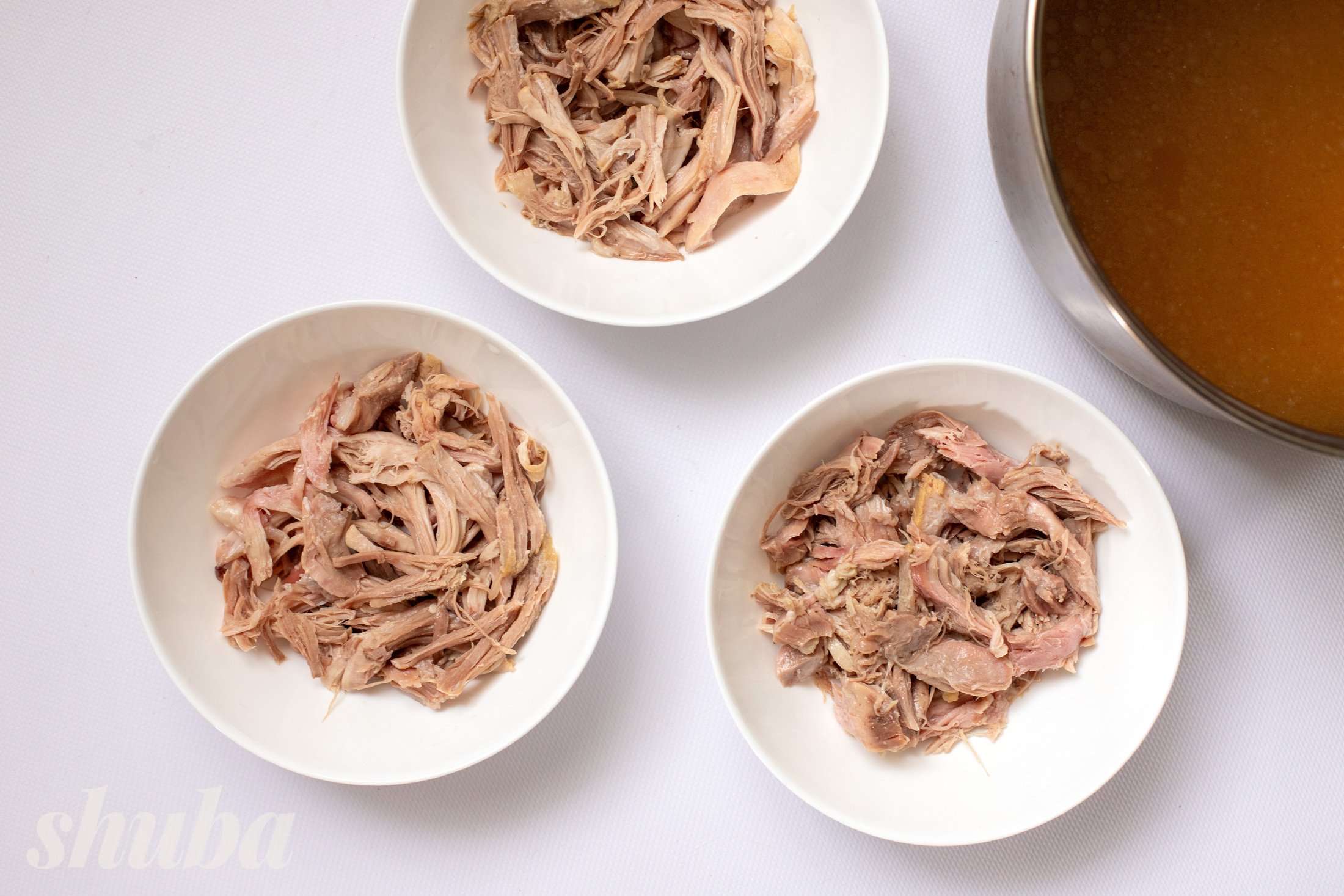 Бульйон проціди, щоб прибрати овочі та спеції. Коли він трохи охолоне, зніми жир із поверхні. М’ясо розбери на волокна і розклади по мисочках.