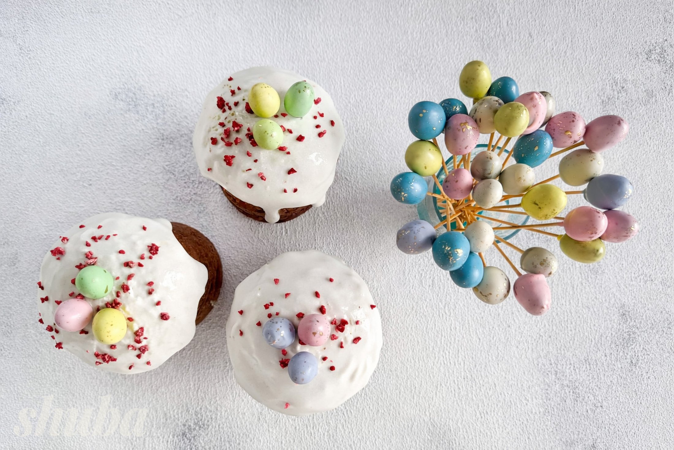 Смачного! Ти отримуєш десерт у стилі кейк-попсів, який легко адаптувати під будь-який настрій — змінюй кольори, декор і форму. Вони добре тримаються, не кришаться і виглядають яскраво. Такий варіант точно не залишиться без уваги на столі. Особливо, якщо для глазурованих яєць ще зробити шоколадні гнізда.