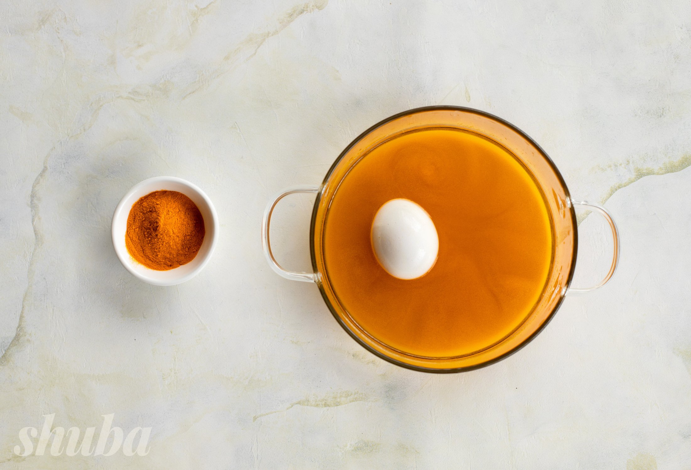 Залий куркуму гарячою водою, перемішай і остуди. Занур яйця і залиш на 1–2 години або на ніч.