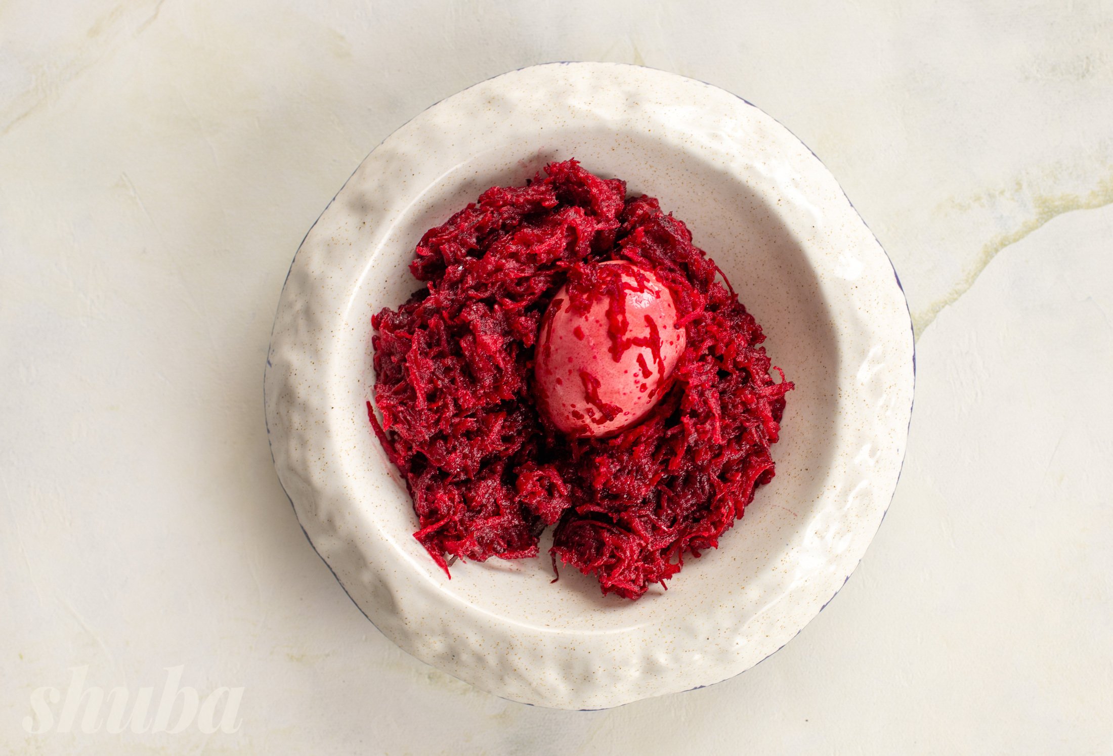 Натри буряк, додай сіль і оцет. Обгорни яйця буряковою масою і залиш на 4–5 годин або на ніч.