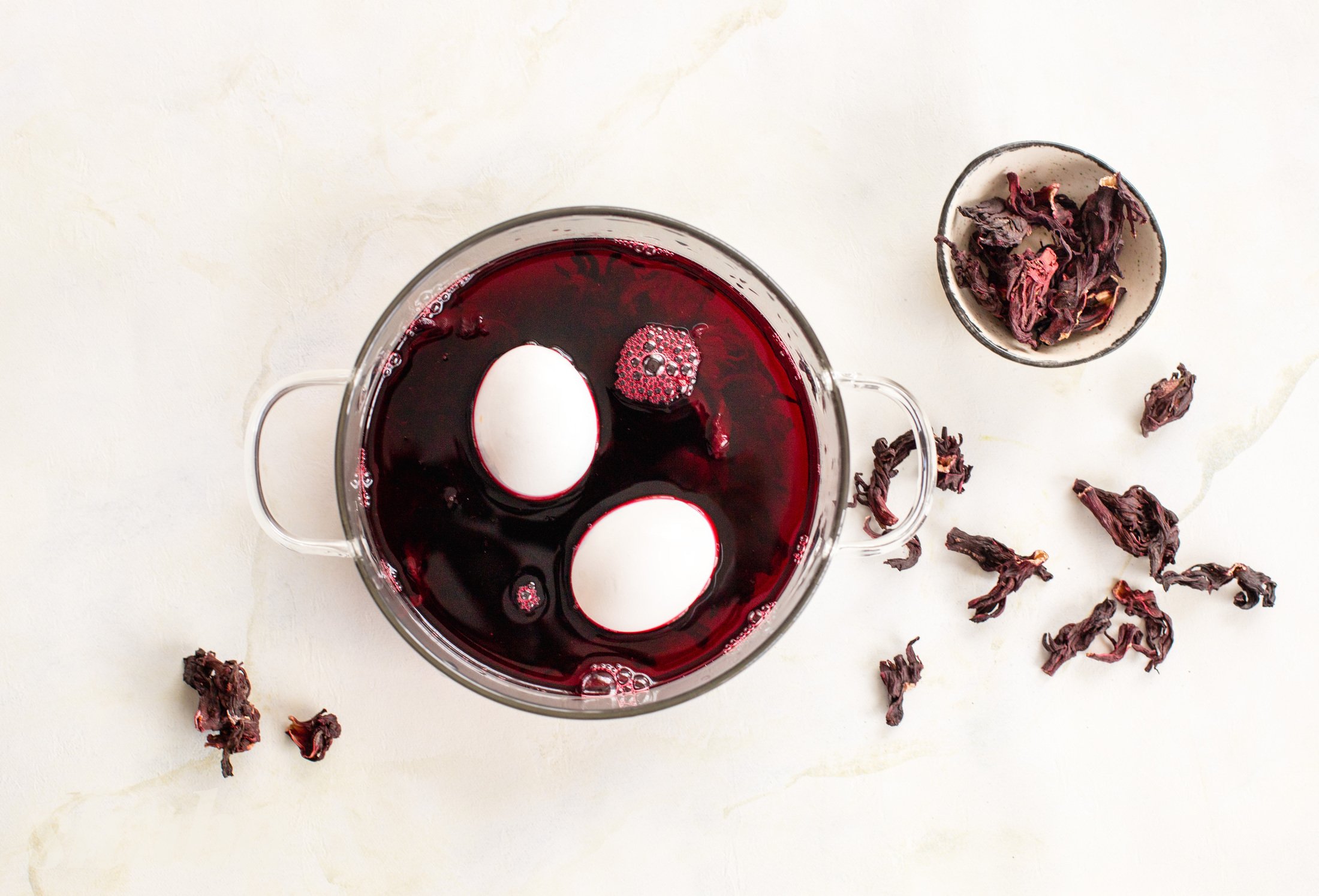 Каркаде фарбує дуже швидко — перевір яйця вже через 10–15 хв, щоб не отримати занадто темний відтінок.
