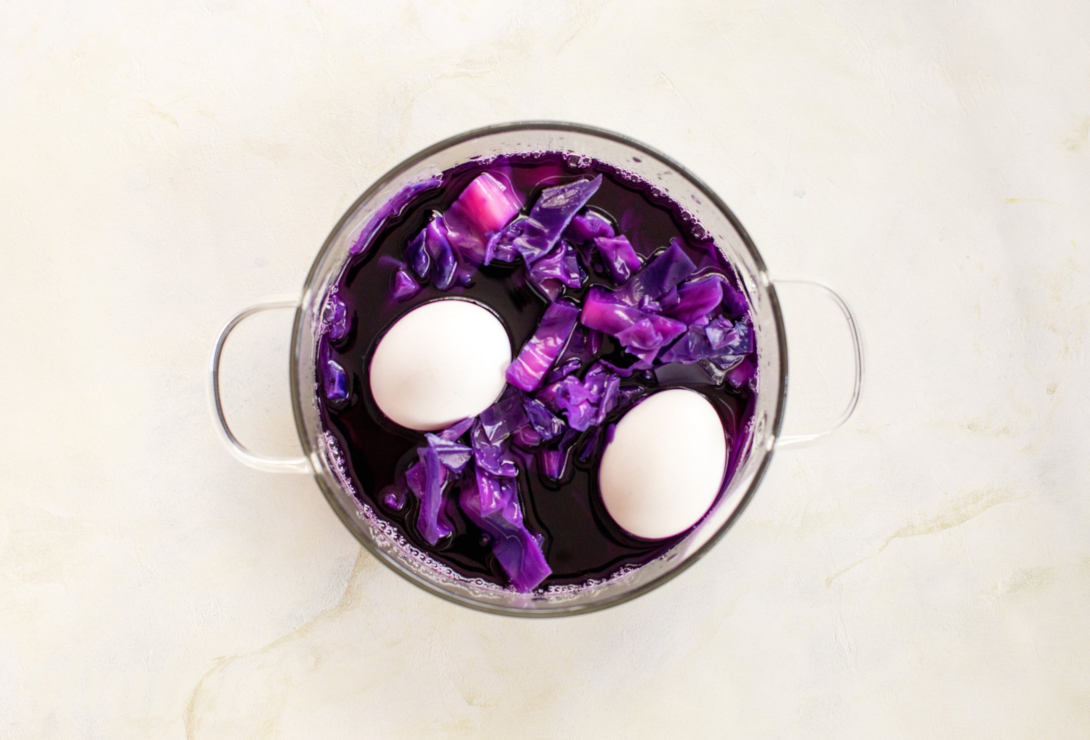 Опусти варені яйця у відвар з капусти і залиш на 20 хвилин або довше — залежно від бажаної інтенсивності кольору.