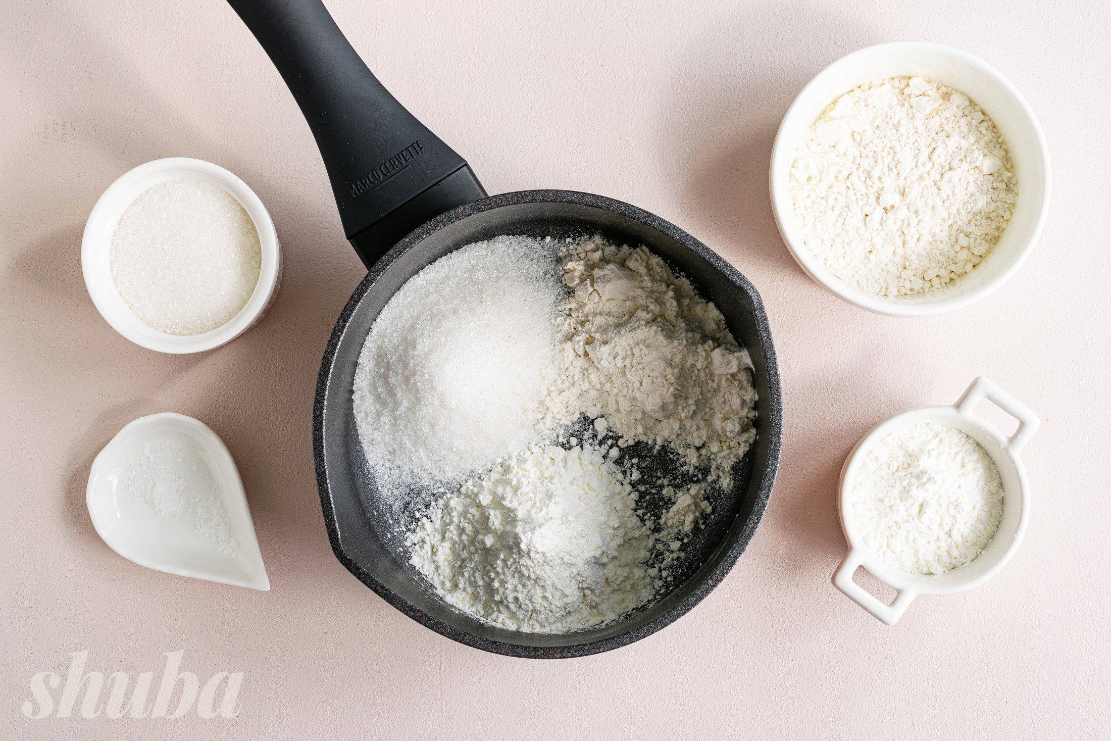 З’єднай у сотейнику крохмаль, борошно, цукор, ванільний цукор і дрібку солі, ретельно перемішай.