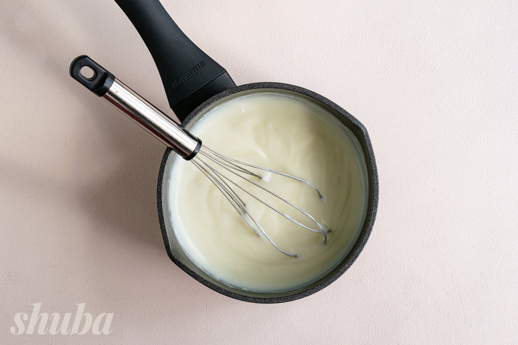 Постав сотейник на маленький вогонь і постійно помішуй масу, поки вона не почне густішати. Після появи перших бульбашок провари масу протягом 30 секунд, не припиняй помішувати.
